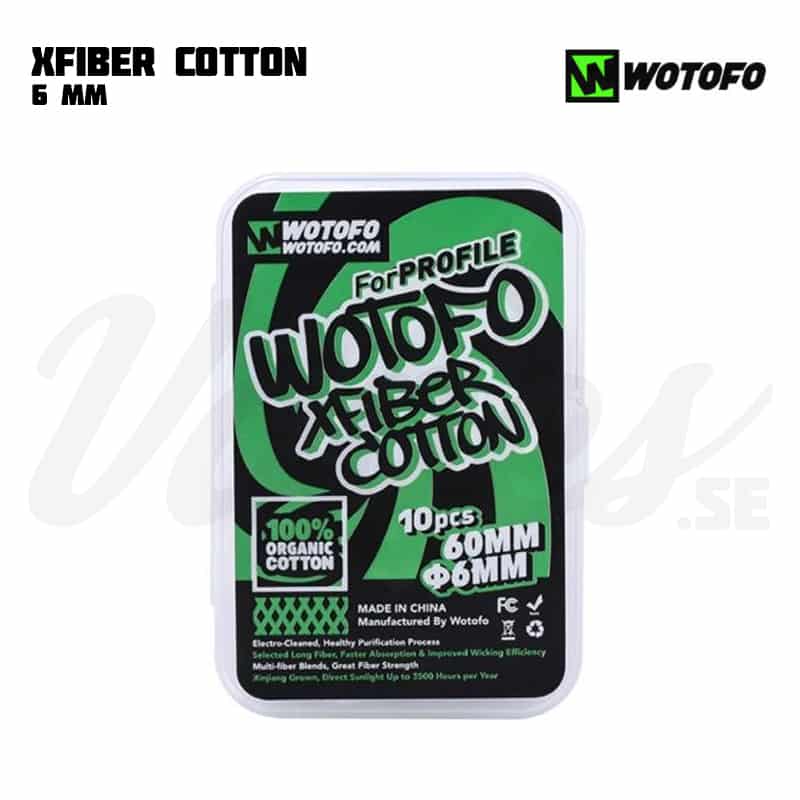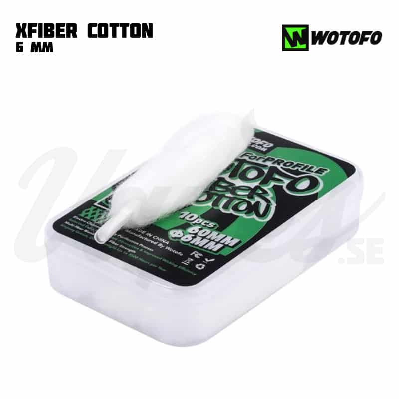 Wotofo Xfiber Cotton är räddningen för smidig montering av bomull i exempelvis Wotofo Profile RDA. Bomullen är ekologisk, har långa fibrer, bra smak och grym absorberingsförmåga. Bomullen är försedd med en plastbit som liknar ändarna på skosnören, för att kunna montera bomullen enkelt. Varje förpackning innehåller 10 st.