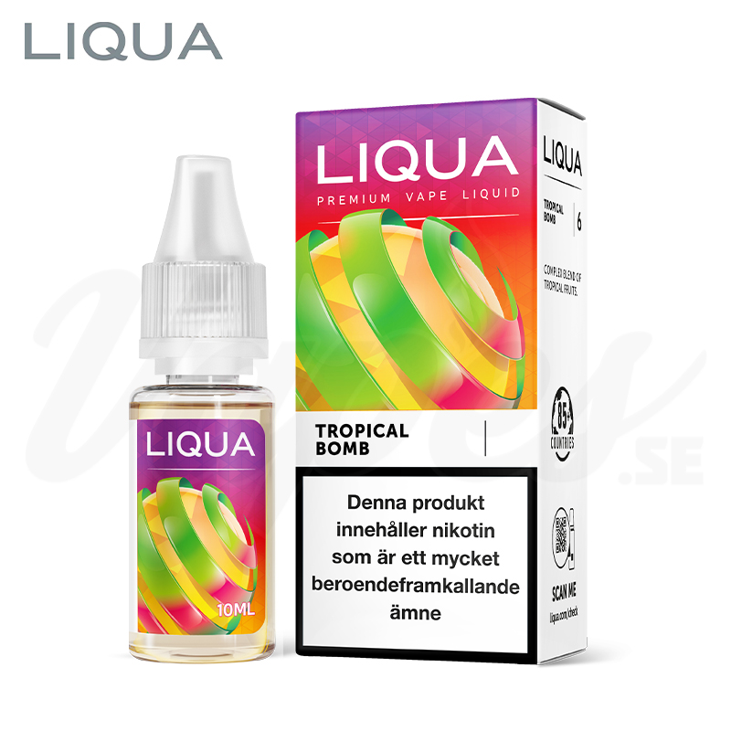 Liqua Tropical Bomb med smak av en tropisk fruktmix. Färdigblandad och lämplig för MTL (coils över 0,8 ohm).