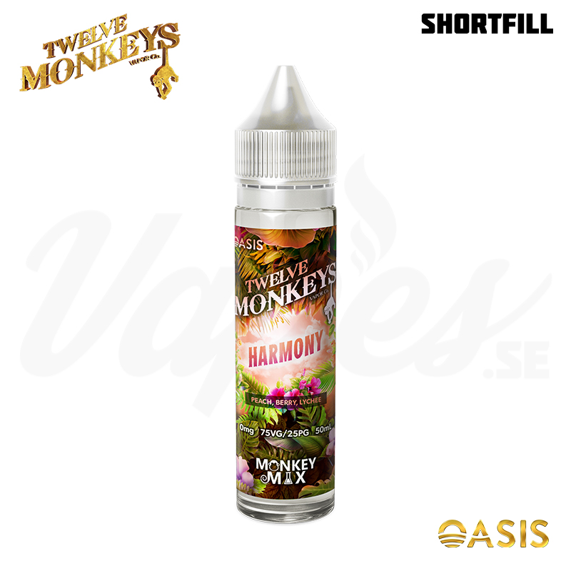 Harmony är en av fyra nya smaker i Twelve Monkeys Oasis serie – med smak av söt persika, bär och exotisk litchi.