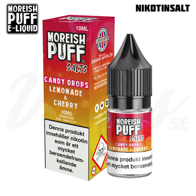 Moreish Puff Candy Drops – Lemonade & Cherry är en e-juice med smak av körsbärslemonad blandat med en söt och syrlig godissmak.