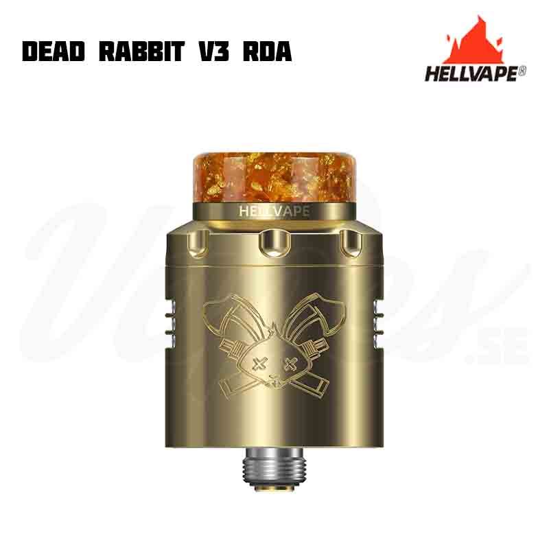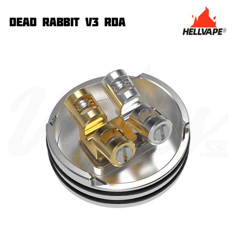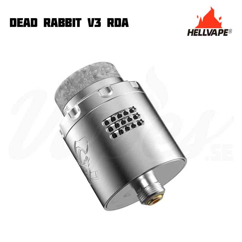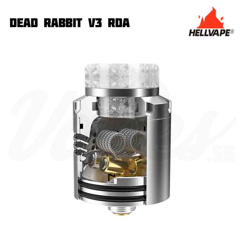 Hellvape Dead Rabbit V3 RDA är en 24 mm diameter RDA, med ett byggdäck utan väggar och en ännu djupare juicewell. Byggdäckets numera friktionslösa och runda poster har utrymme undertill för lättare avklippning av coilbenen, vilket gör montering av coils & bomull smärtfritt. Det får plats 1-2 coils i byggdäcket och det finns gott om plats. Luftflödet är riktat mot coilsen för effektiv nedkylning och maximerad ångproduktion. Juicewellen förstorades i den tidigare versionen, men även i denna – så risken för läckage vid överdrippning är nu ännu mindre. Munstycket är en antibakteriell 810-drip tip och du får med en 510-adapter om du vill köra med ett mer restriktivt luftflöde (RDL/MTL). Anslutningen är utrustad med en standard 510 pin och det medföljer även en guldpläterad 510-pin för den som vill köra squonk (matning av e-juice underifrån din RDA).