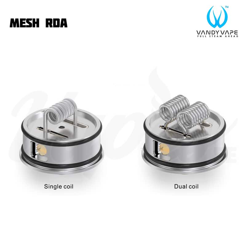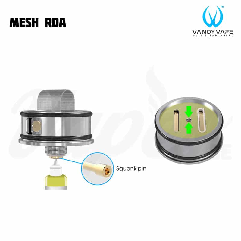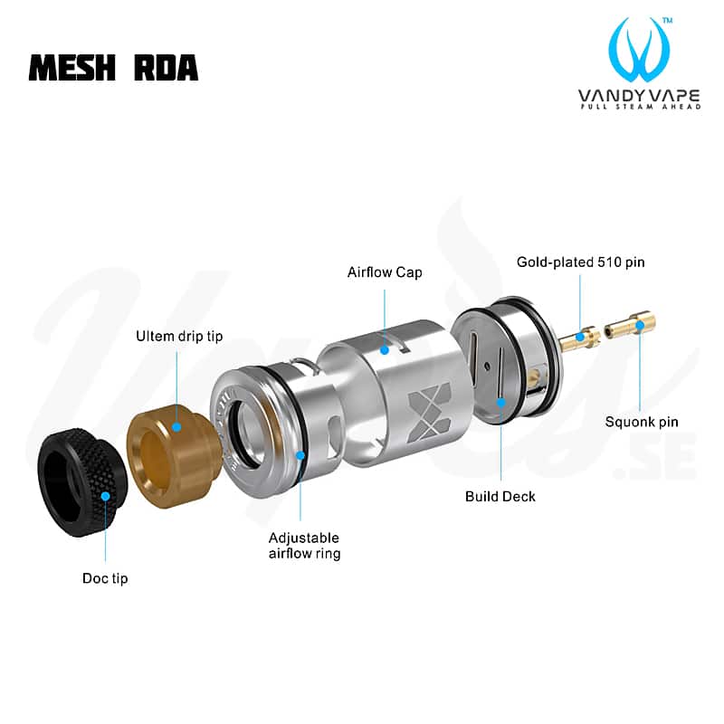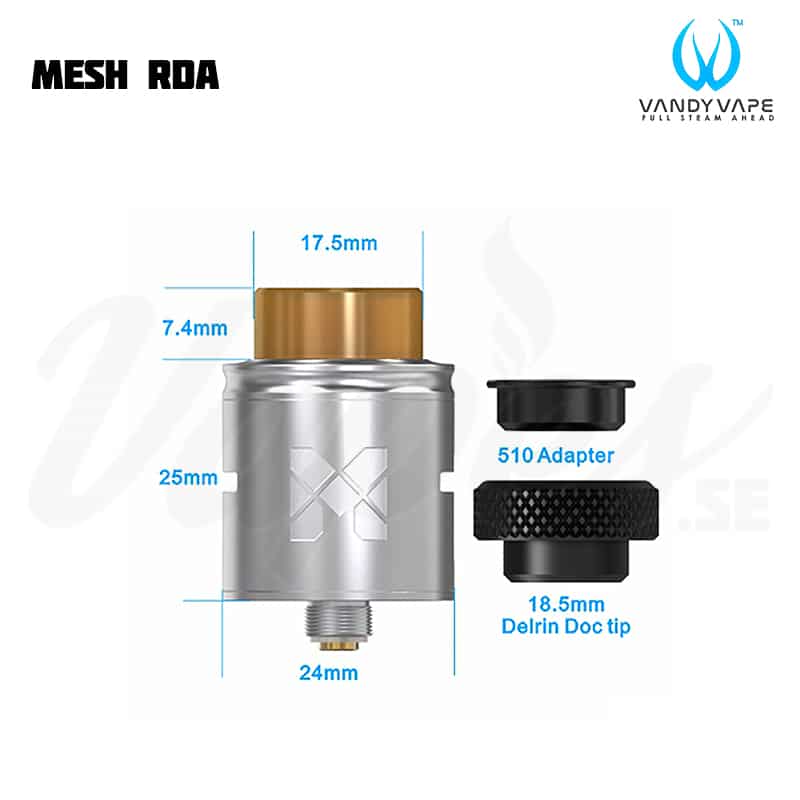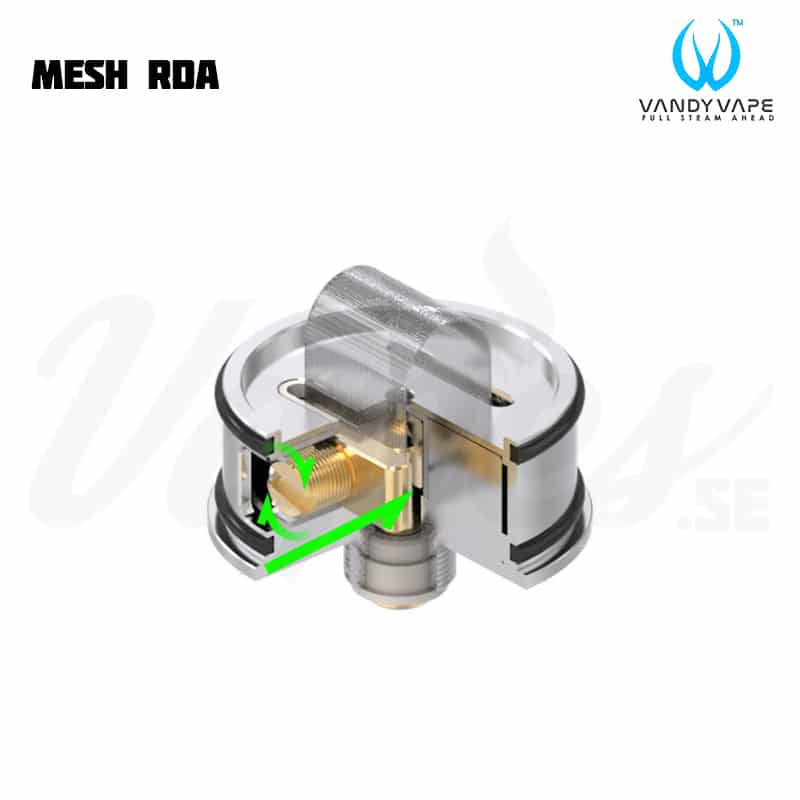 Vandy Vape Mesh RDA är en 24 mm RDA som fungerar både med traditionella RBA coils och Mesh coils. Med både 510 pin och BF Pin kan du välja att köra med en vanlig mod eller squonkmod.