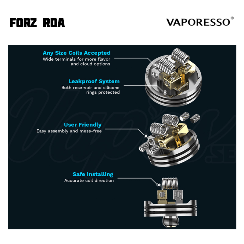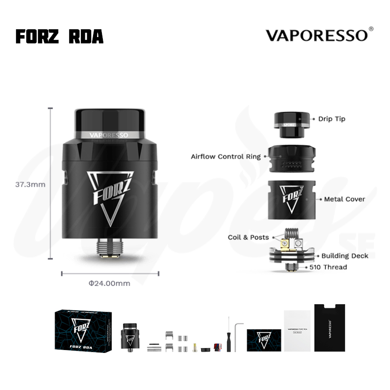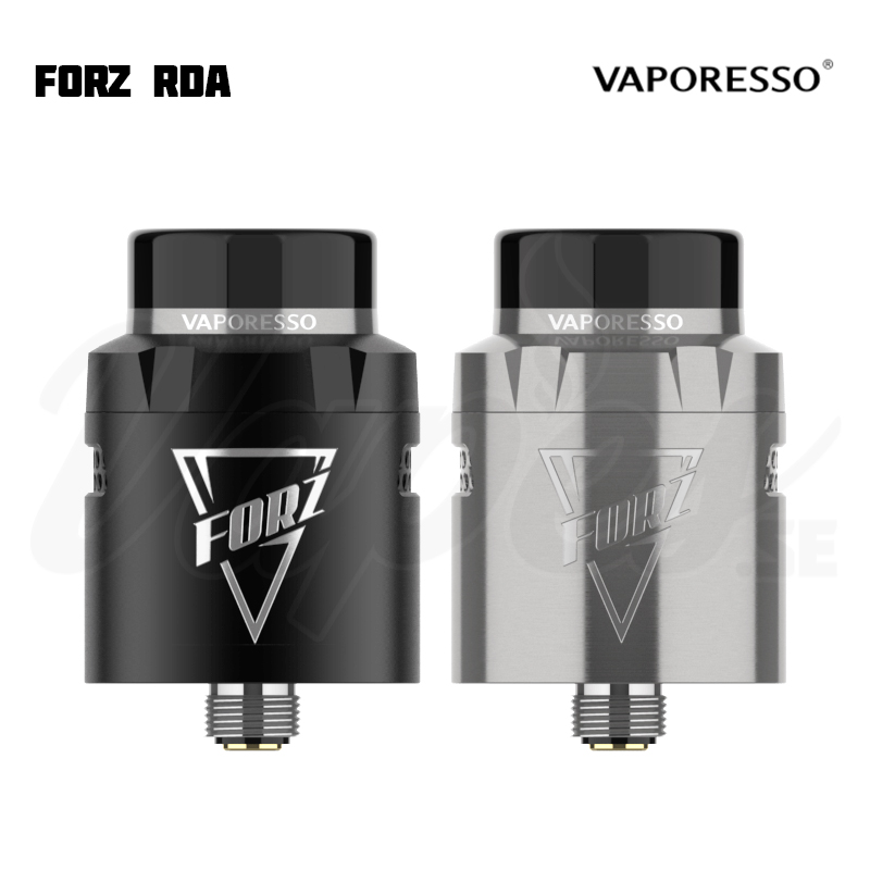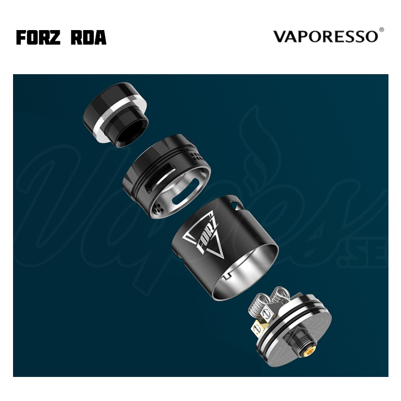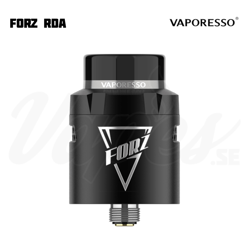Vaporesso FORZ RDA är en 24 mm diameter RDA från Vaporesso som både är kompatibel med standard 510 moddar och även squonk med medföljande BF-pin. Luftflödet har två olika lägen – ett justerbart sidoluftflöde i honeycomb-stil som riktar luften direkt mot coilsen, samt öppet luftflöde för DL. Byggdäcket har fyra terminaler som lämpar sig för totalt två coils, med en vätskereservoar i botten av byggdäcket som är tätat mot läckage via silikonringar. Terminalerna har stöd även för tjockare coilben. Du kan välja att använda 810-drip tipen, eller använda medföljande 510-adapter för att köra med 510 drip tips (vid behov av MTL).