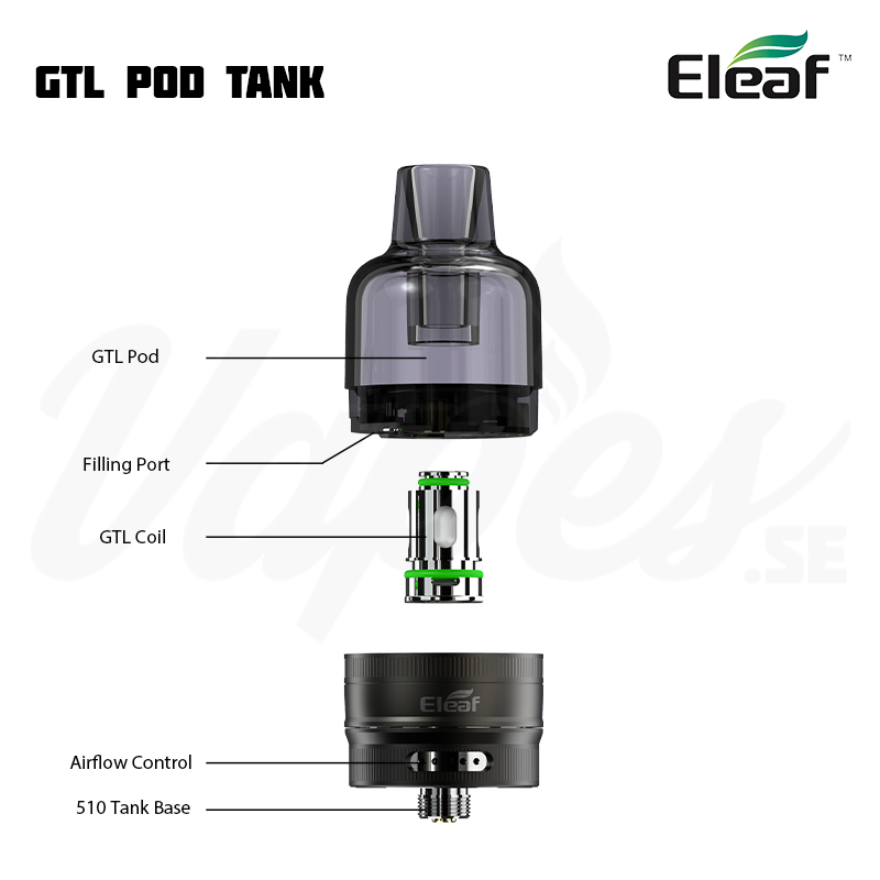 GTL Pod Tank passar alla 510-gängade enheter med tankbasen. Den har en precis luftflödeskontroll med dubbla sidor, där varje sida har ett stort hål och fem små hål, vilket garanterar fria justeringar mellan tight och öppet luftintag. GTL Pod Tank är tillverkad av PCTG och rostfritt stål.