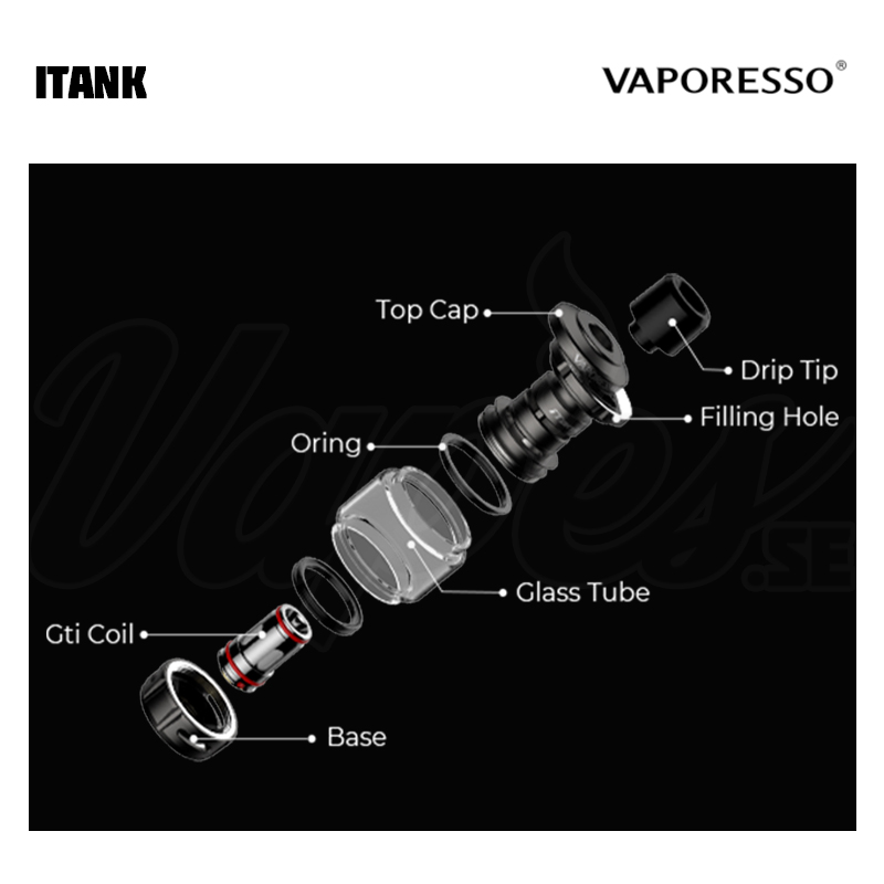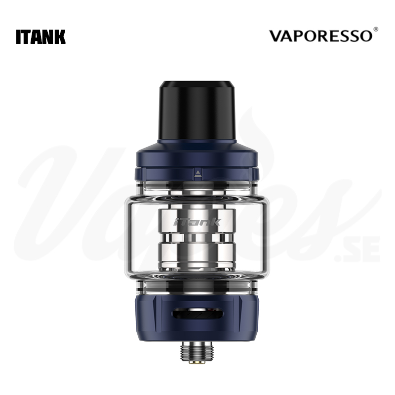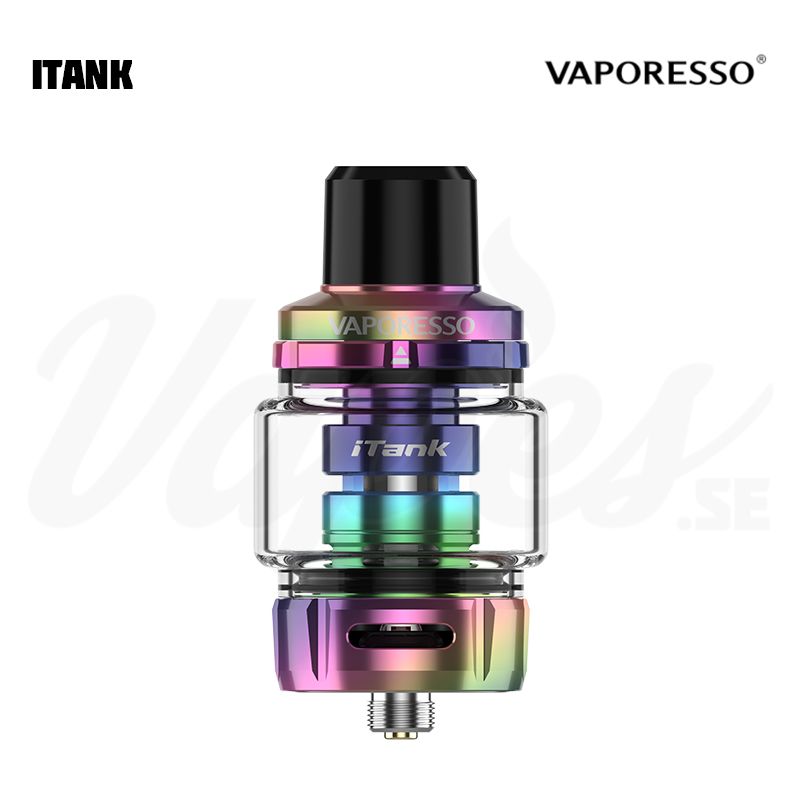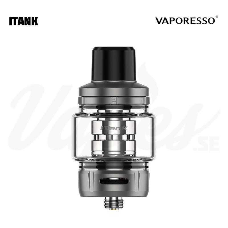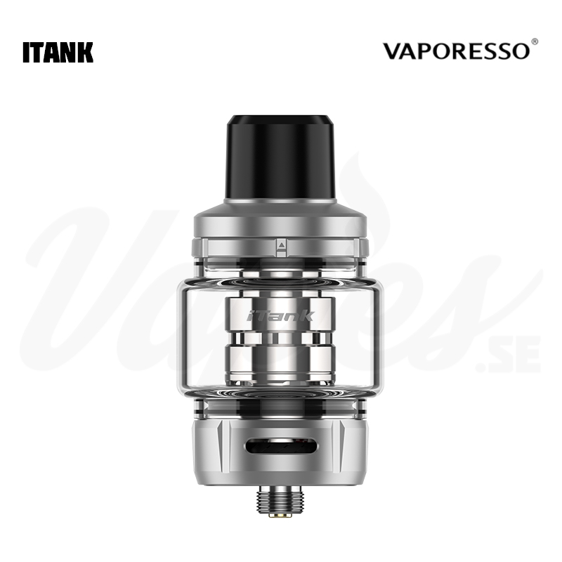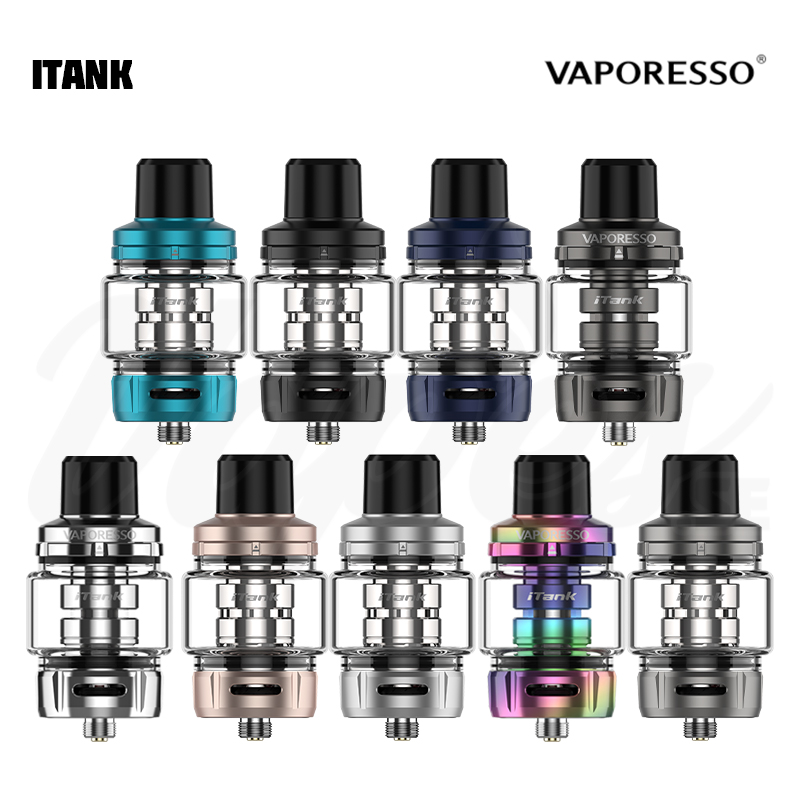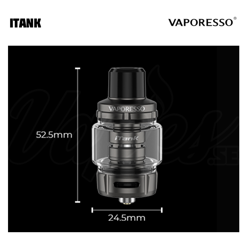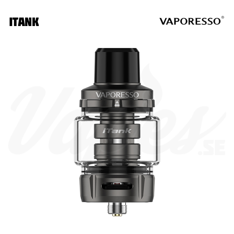 Vaporesso iTank är en 24,5 mm diameter tank med 8 ml vätskekapacitet, med pull-and-push teknik som låter coilsen installeras genom att trycka in dem istället för att skruva. Den är kompatibel med samtliga Vaporesso GTi Coils och det medföljer två coils; GTi 0,2 Ω MESH Coil (60 – 75 W) och GTi 0,4 Ω MESH Coil (50 – 60 W). Påfyllning sker via skjutbart topplock och luftflödet går att justera efter personliga behov.
