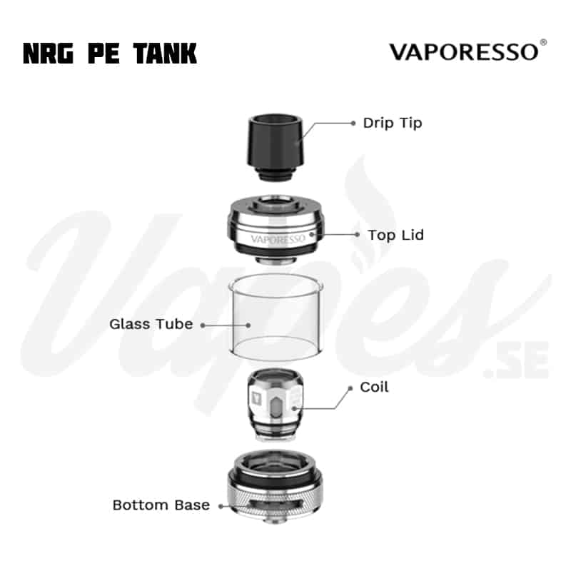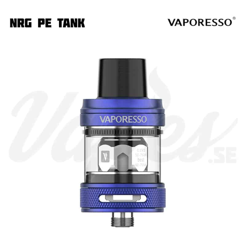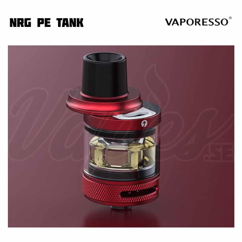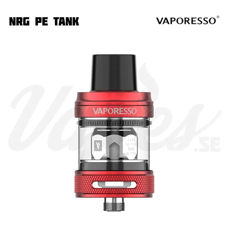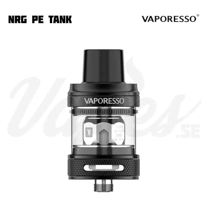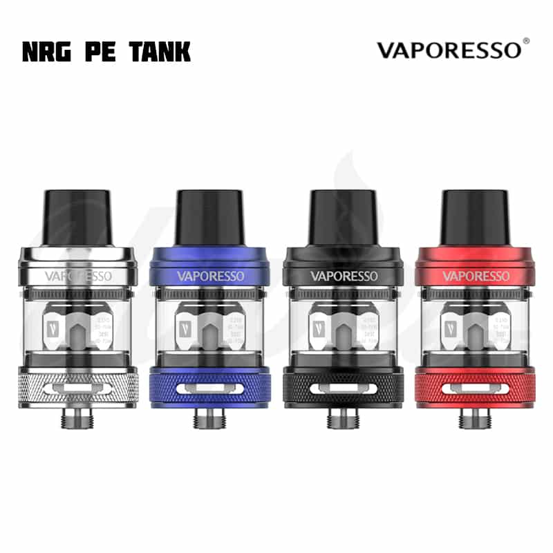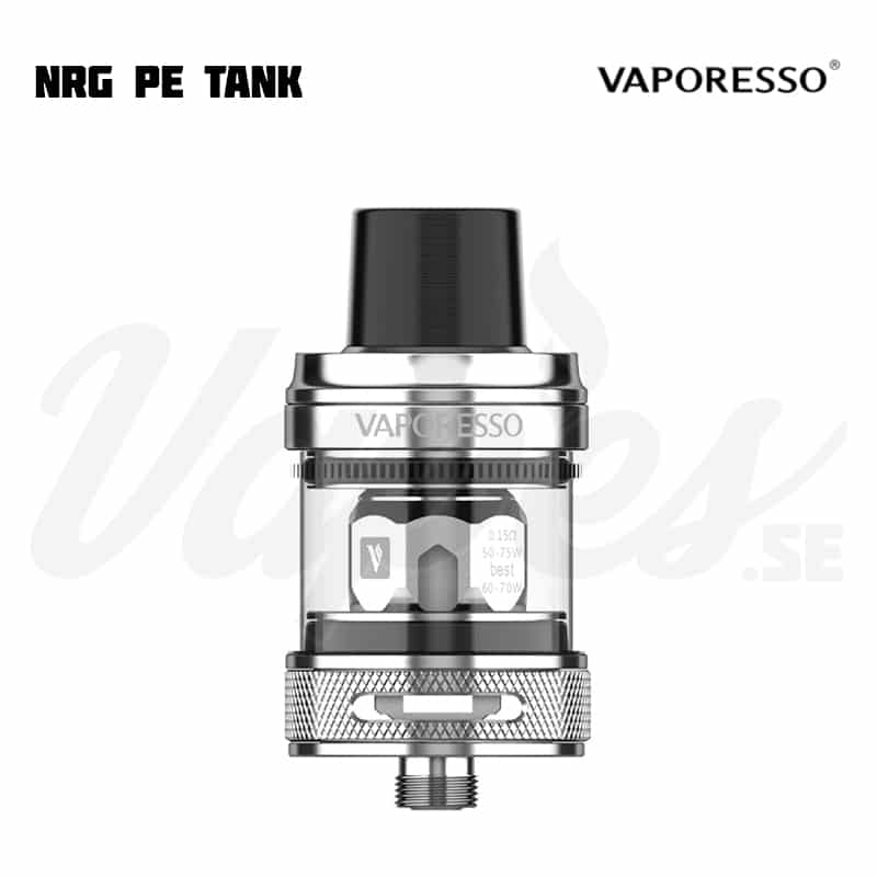 Vaporesso NRG PE Tank är en 25 mm diameter tank med 3,5 ml vätskekapacitet. Den använder sig av de populära Vaporesso GT Coilsen och det medföljer nya GT4 Meshed coils med denna tank, som är på 0,15 ohm och fungerar bäst mellan 60 – 70 W. Utöver denna nya coil medföljer även en GT CCELL 0,5 ohm coil som är bäst mellan 25-35 W (mer åt MTL-hållet). Luftflödet är justerbart och går att anpassa för direkta lungbloss (DL) och mer restriktivt för mun-till-lunga (MTL). Påfyllning sker via toppen med ett skjutbart topplock.