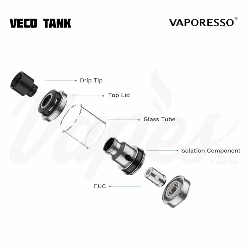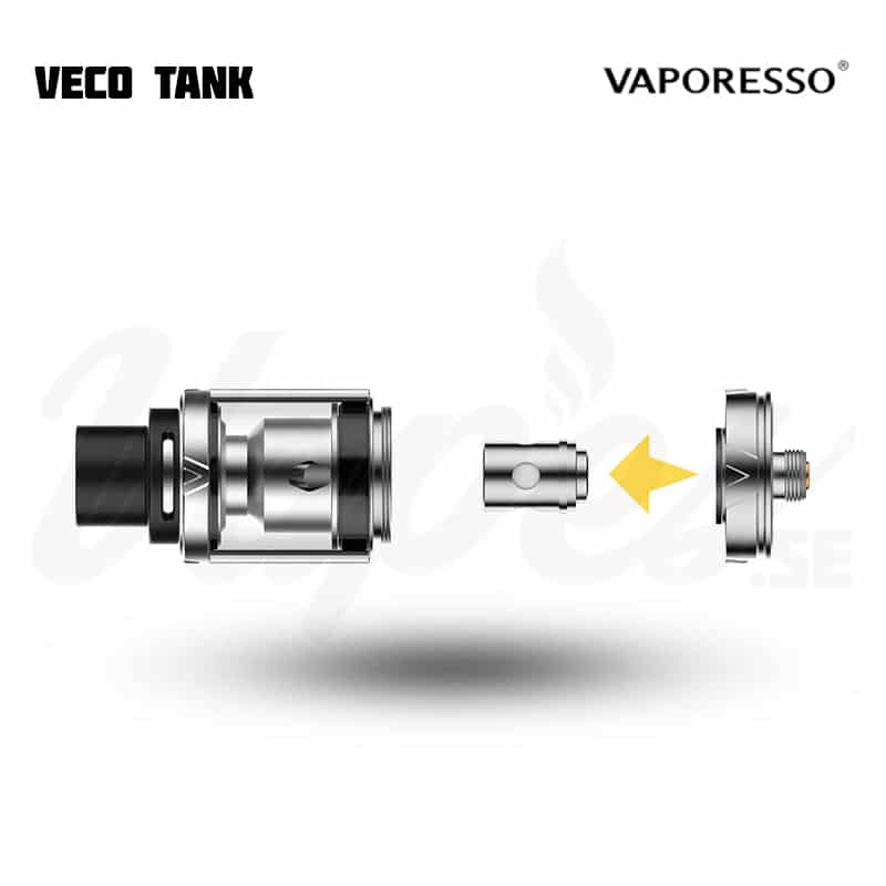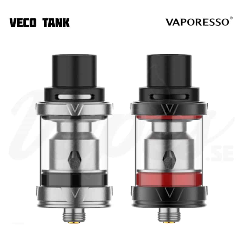 Vaporesso VECO Tank är en 22 mm diameter tank med 2 ml vätskekapacitet. Den fylls på otroligt smidigt via så kallad top fill. Skruva av topplocket och fyll på med e-juice (på sidorna, ej i skorstenen). Luftflödet justeras via toppen och du kan ställa in det så att det passar dig bäst.