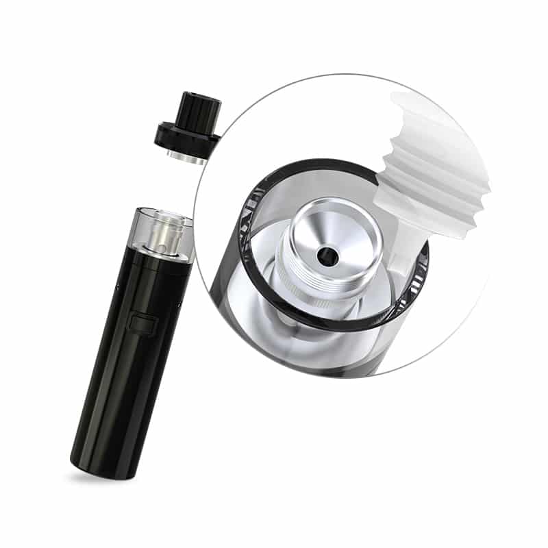 Det är otroligt simpelt att fylla på med e-juice i tanken. Med så kallad Top Fill, så skruvar du helt enkelt av locket vid munstycket på tanken. Därefter fyller du upp tanken med din favoritsmak. Häll vid sidorna om glaset, inte ner i “skorstenen”. (Se bild)