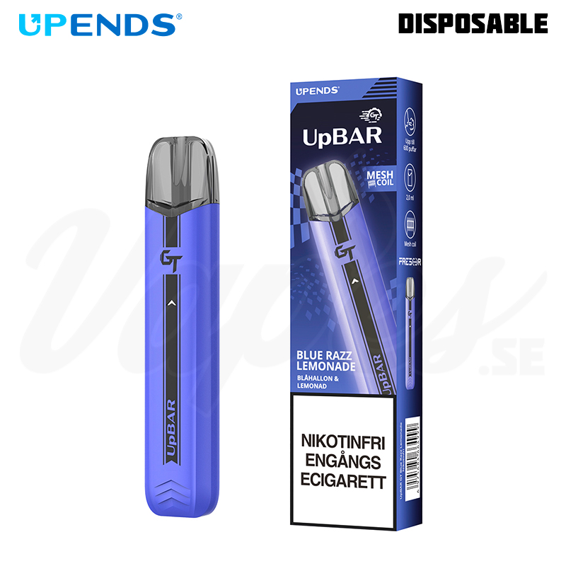 UpBar GT Disposables – tillverkade av UPENDS, är påfyllda och uppladdade e-cigaretter som aktiveras direkt vid inhalering. Inga inställningar krävs och produkten är redo att användas omedelbart. De är inte påfyllnings- eller uppladdningsbara. När smaken avtar eller batteriet tagit slut kasserar du produkten. Se den svenska bipacksedeln för mer information om innehåll, förvaringsinstruktioner, varningar om nikotin med mera.