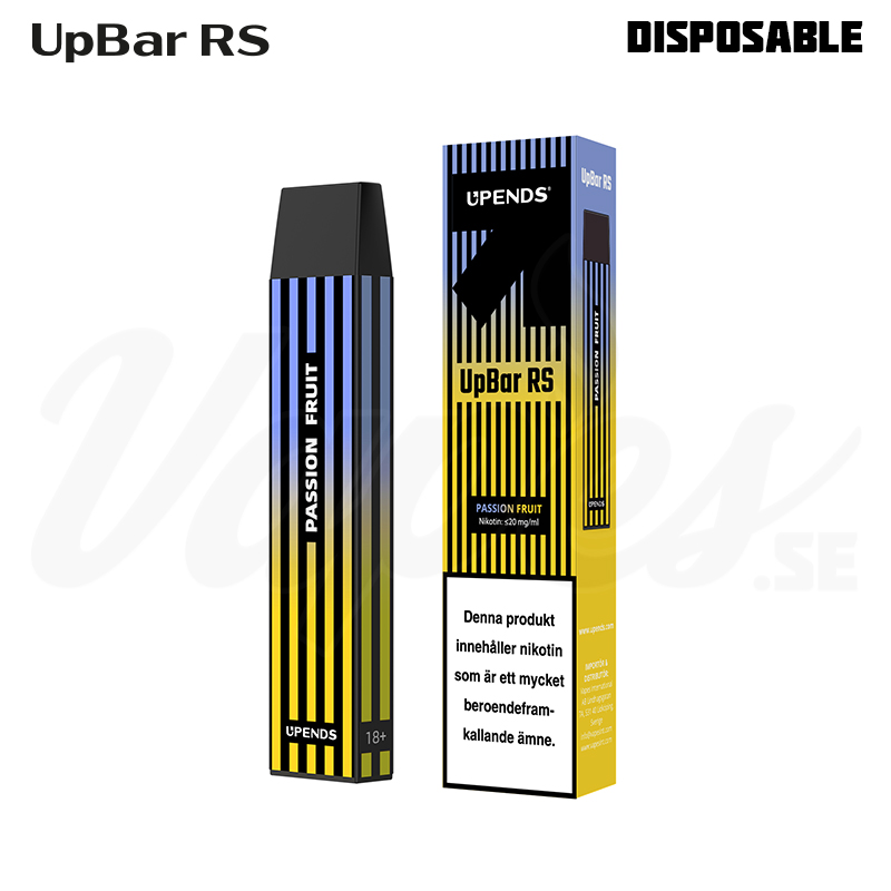 UpBar RS Passion Fruit är en engångs vape (disposable), med smak av passionsfrukt & mentol. Nikotinstyrka är 20 mg/ml (2,0 %) och är av typen nikotinsalt.