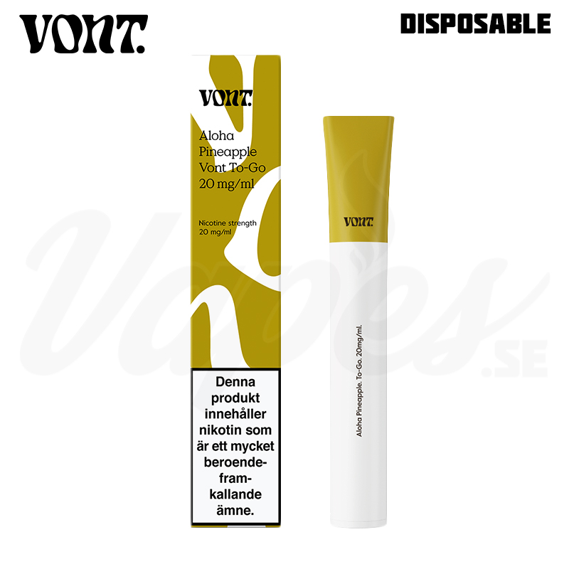 Aloha Pineapple från svenska VONT To-Go serien är en engångsvape med 20 mg nikotinsalt. VONT To-Go räcker upp till 800 puffar. Aloha Pineapple har en smak av tropiska frukter och ananas.