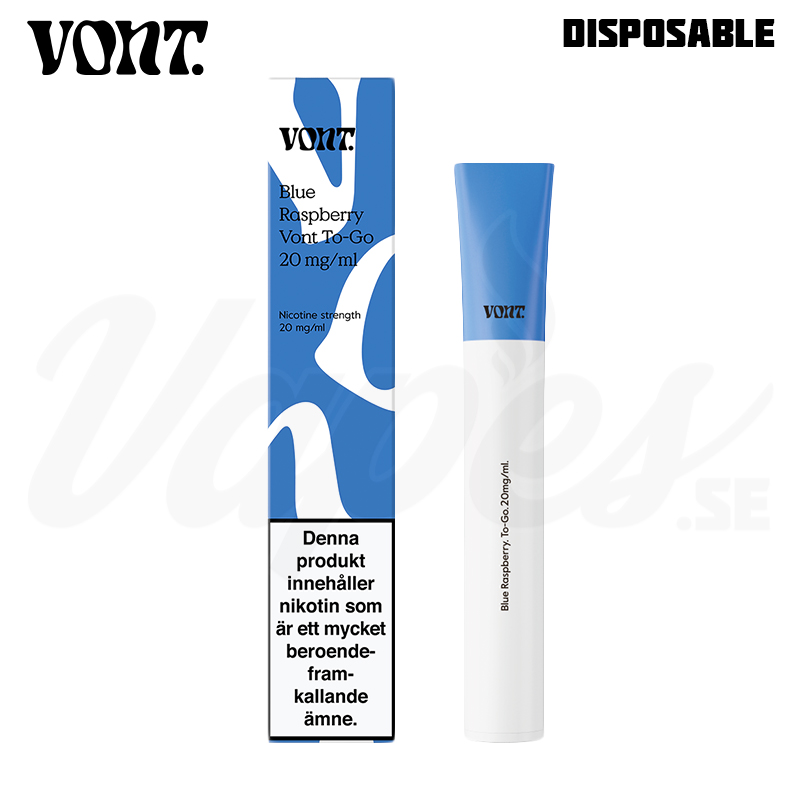 Blue Raspberry från svenska VONT To-Go serien är en engångsvape med 20 mg nikotinsalt. VONT To-Go räcker upp till 800 puffar. Blue Raspberry har en smak av blåhallon och en hint av slush.