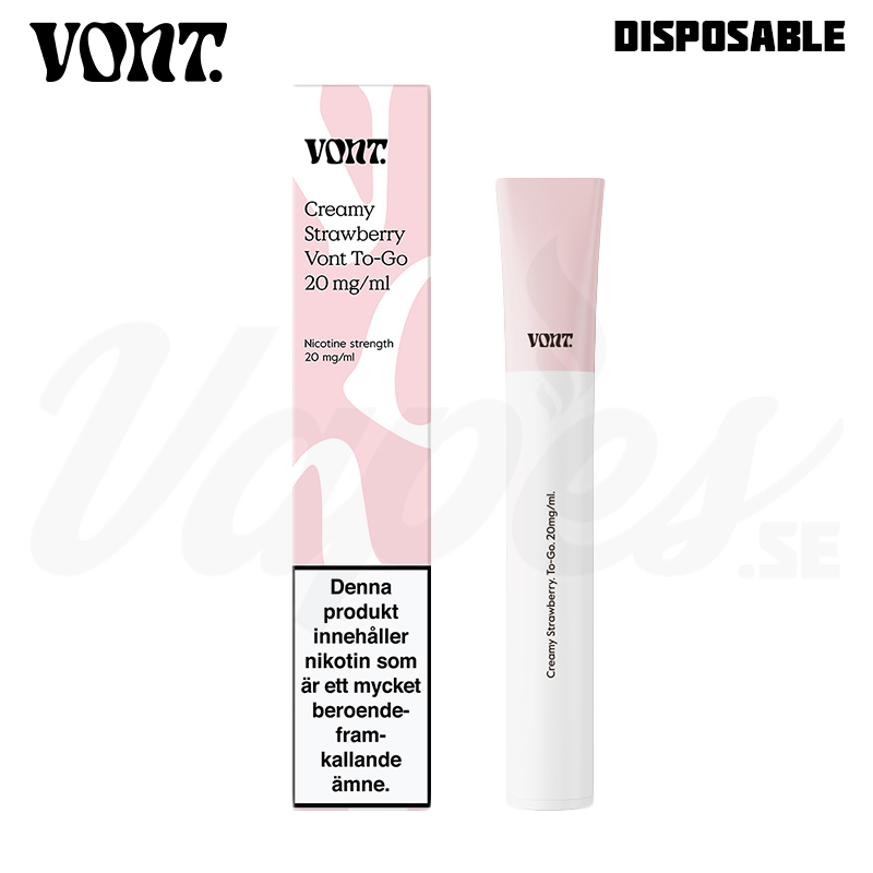 Creamy Strawberry från svenska VONT To-Go serien är en engångsvape med 20 mg nikotinsalt. VONT To-Go räcker upp till 800 puffar. Creamy Strawberry har en smakkombo av söta jordgubbar och andra röda frukter, med vaniljkräm.