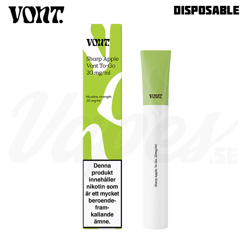 Sharp Apple från svenska VONT To-Go serien är en engångsvape med 20 mg nikotinsalt. VONT To-Go räcker upp till 800 puffar. Sharp Apple har en smak av gröna äpplen.