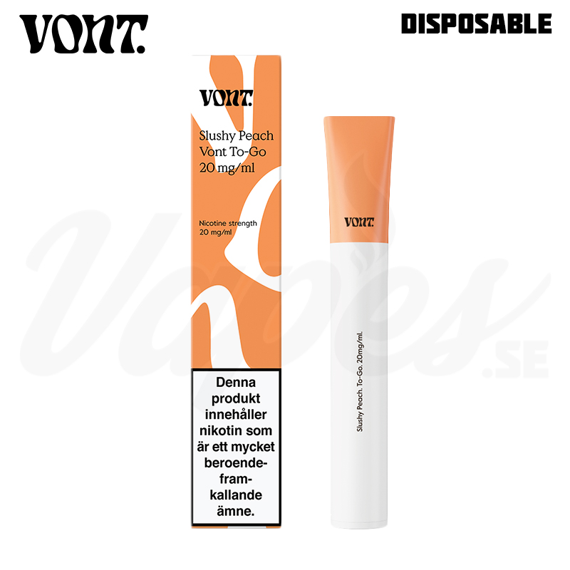 Slushy Peach från svenska VONT To-Go serien är en engångsvape med 20 mg nikotinsalt. VONT To-Go räcker upp till 800 puffar. Slushy Peach har en smak av persikor och slush.