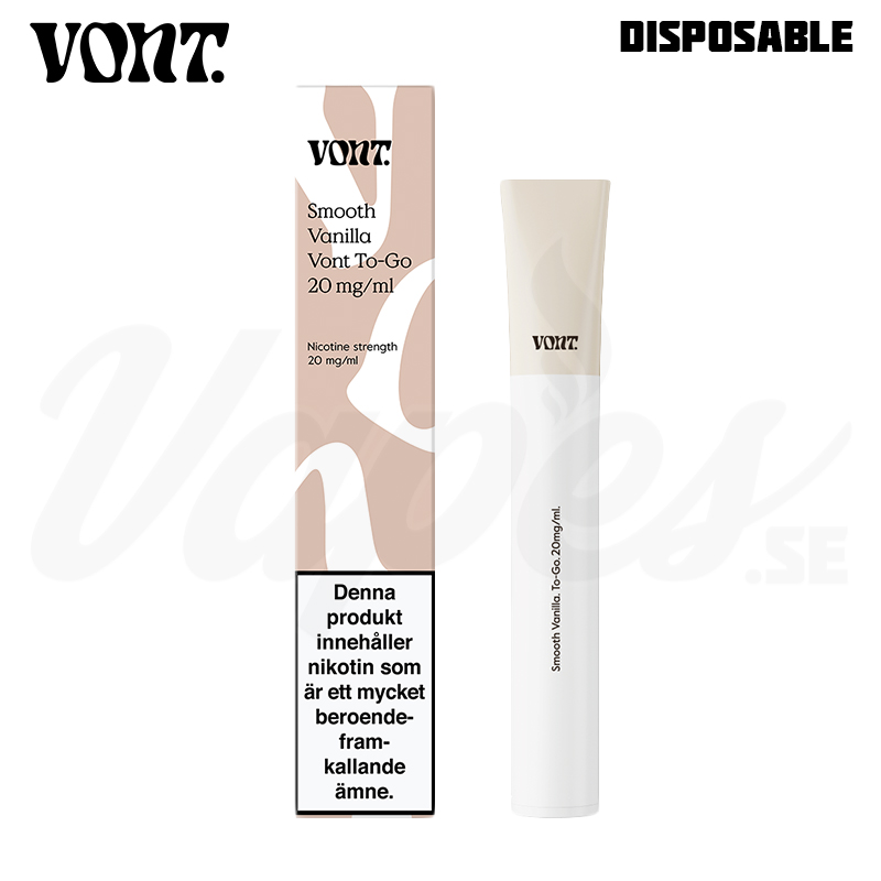 Smooth Vanilla från svenska VONT To-Go serien är en engångsvape med 20 mg nikotinsalt. VONT To-Go räcker upp till 800 puffar. Smooth Vanilla har en smak av vaniljsås (dessert).