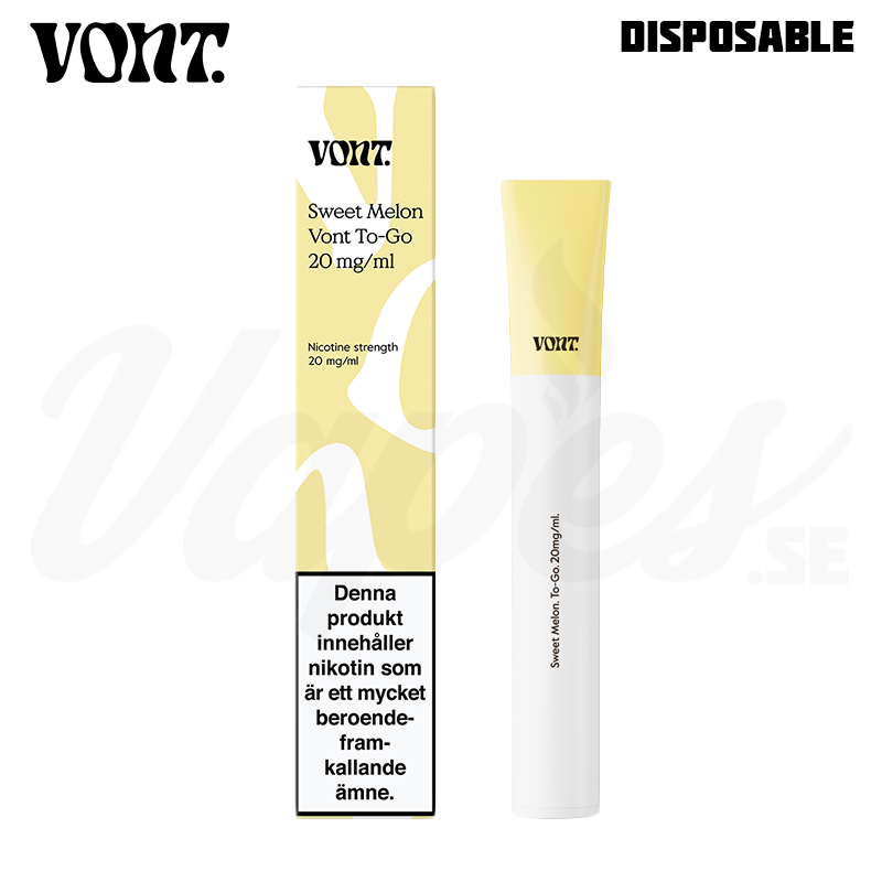 Sweet Melon från svenska VONT To-Go serien är en engångsvape med 20 mg nikotinsalt. VONT To-Go räcker upp till 800 puffar. Sweet Melon har en smak av söt melon.