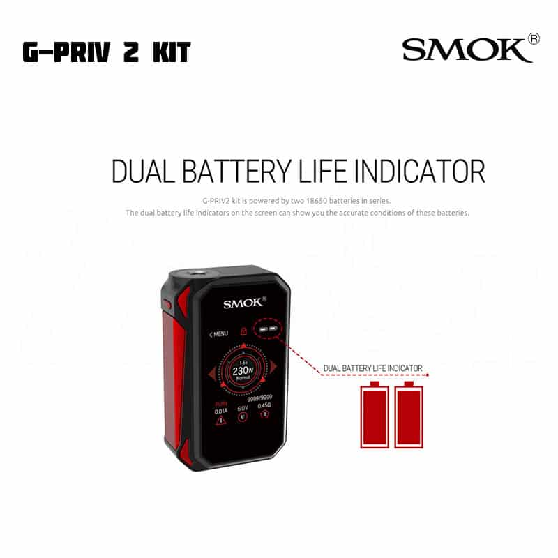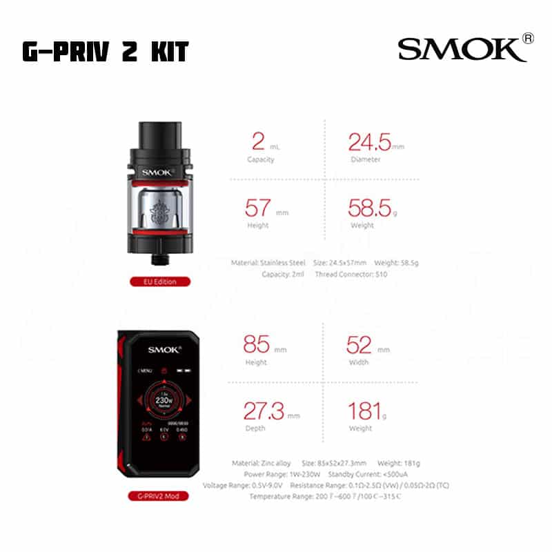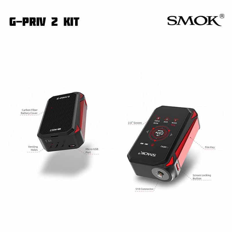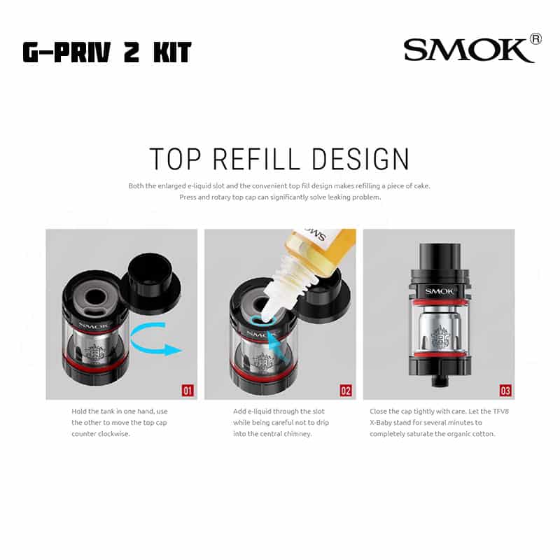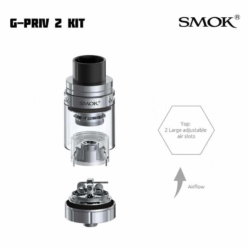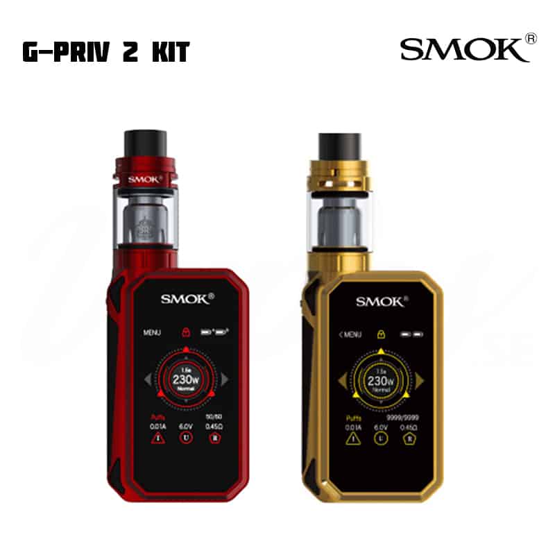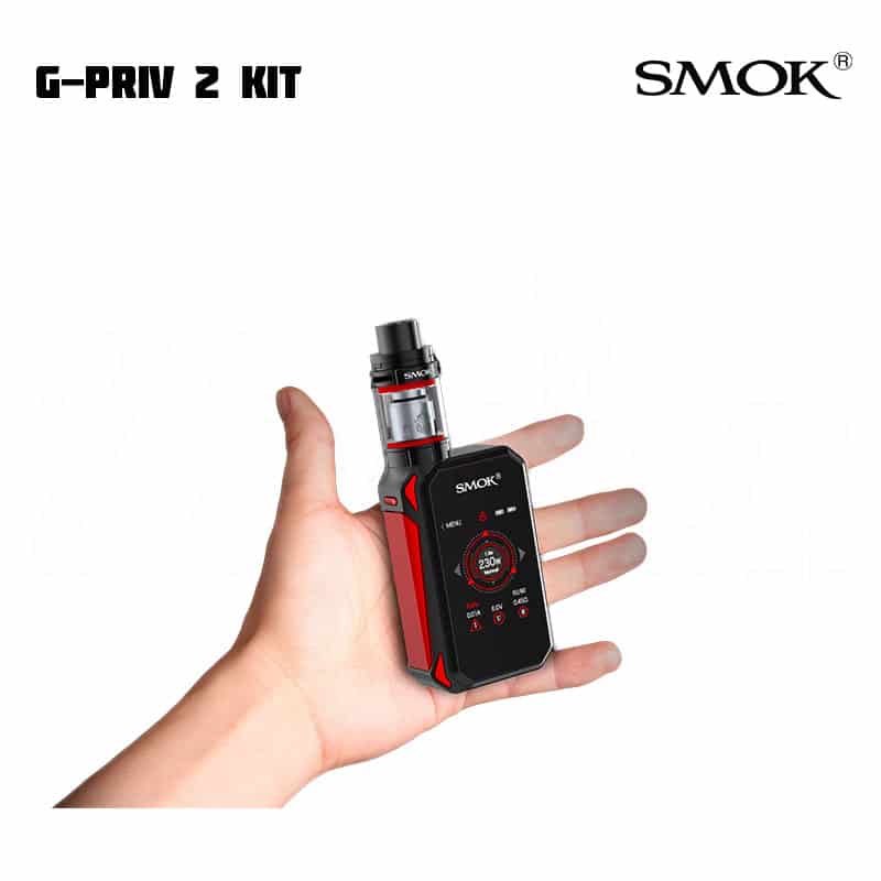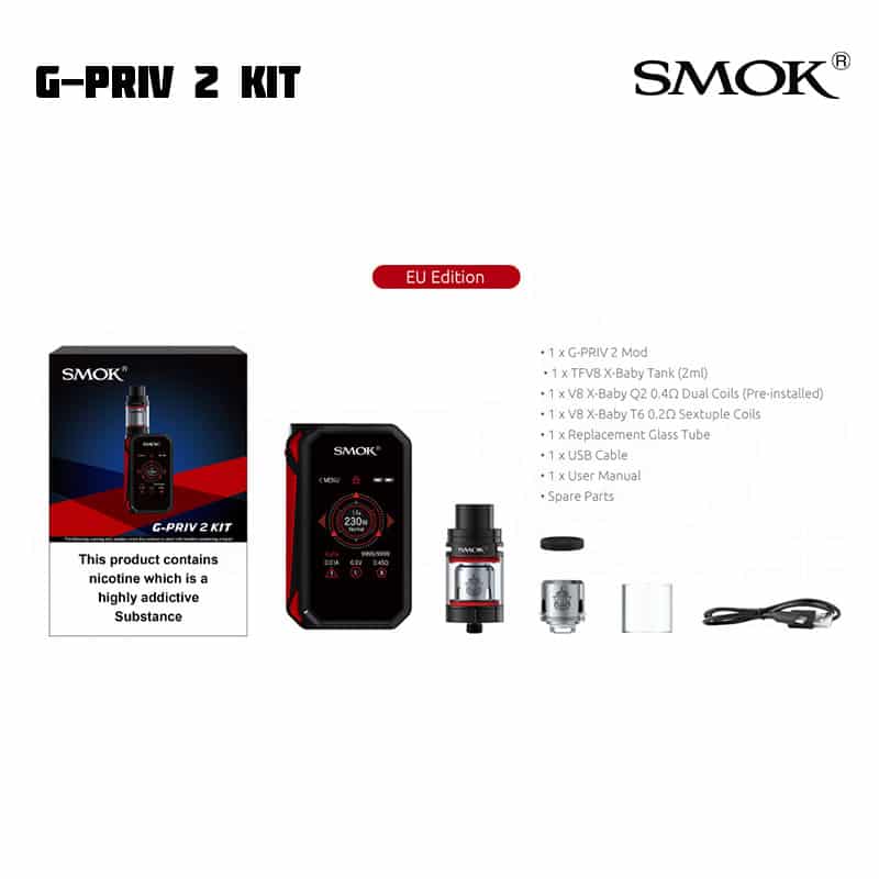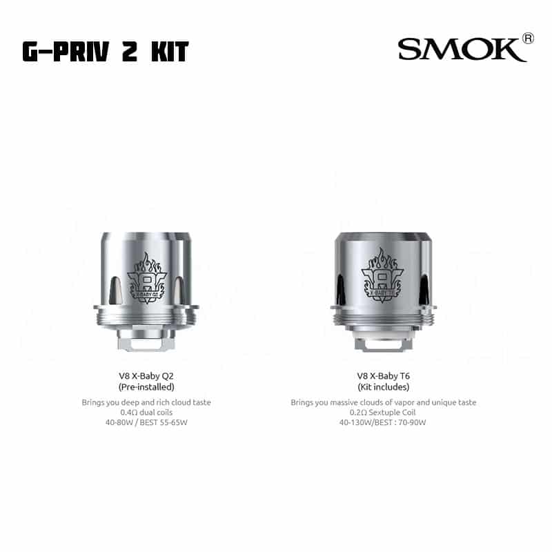 SMOK G-Priv 2 låter dig justera inställningar via en touchscreen. Modden kan gå upp till 230 W. Till skillnad från tidigare modell har denna även en låsknapp för skärmen, för de tillfällen du ska ha den i fickan. SMOK TFV8 X-Baby har ett justerbart luftflöde på toppen, en ny design och nya coils. E-juice fylls på via top fill på tanken.