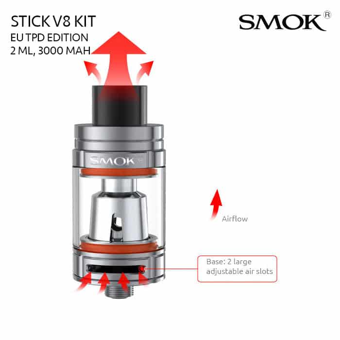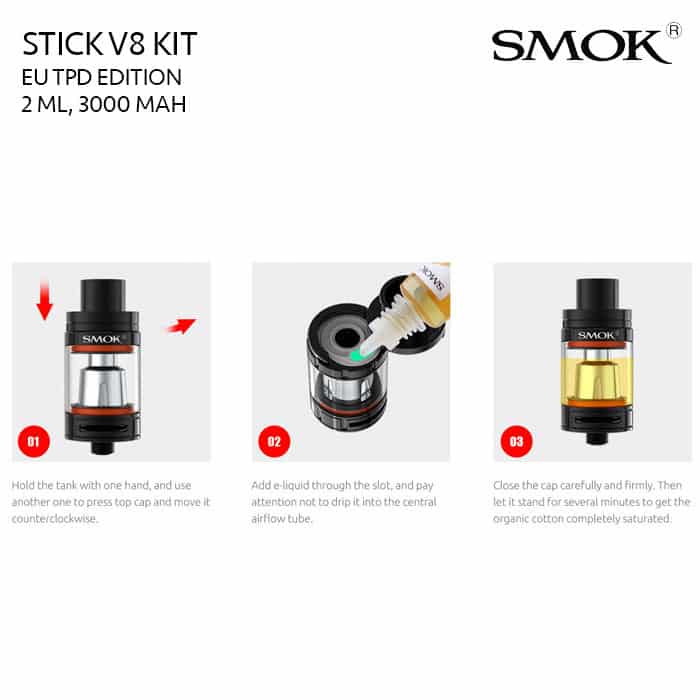 SMOK Stick V8 Kit är ett komplett startkit och du behöver inte köpa till något mer än e-juice för att komma igång. Det inbyggda batteriet har 3000 mAh och räcker en hel dag. Tanken (TFV8 Big Baby Tank TP) rymmer 2 ml vätskekapacitet och fylls på via top fill. 5 klick räcker för att sätta igång/starta den och du behöver bara hålla inne knappen för att börja vejpa.