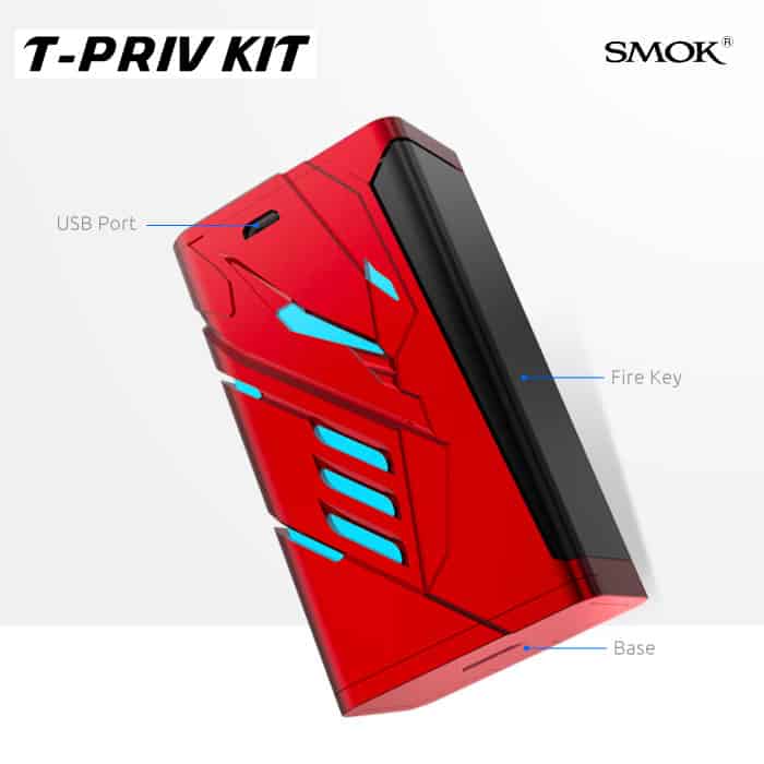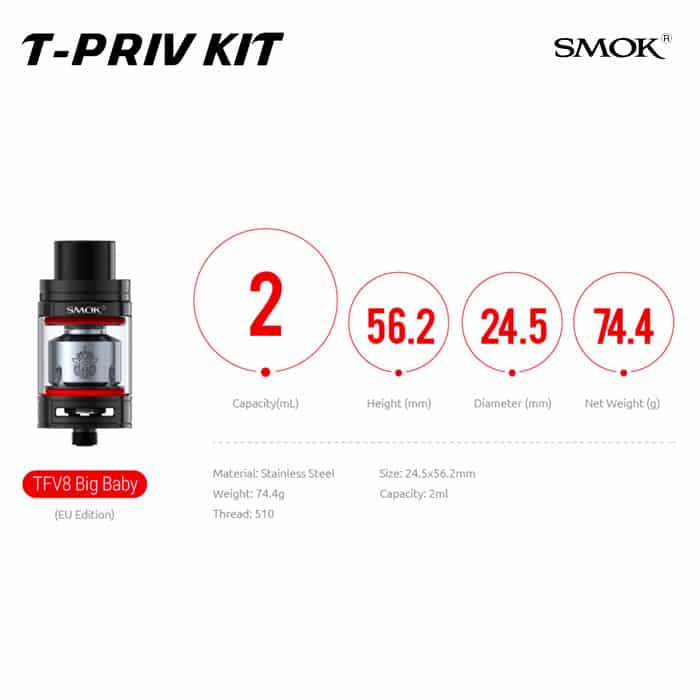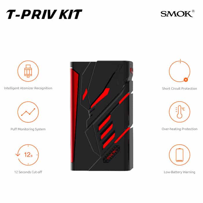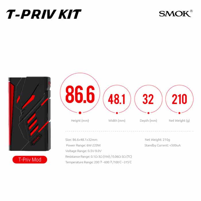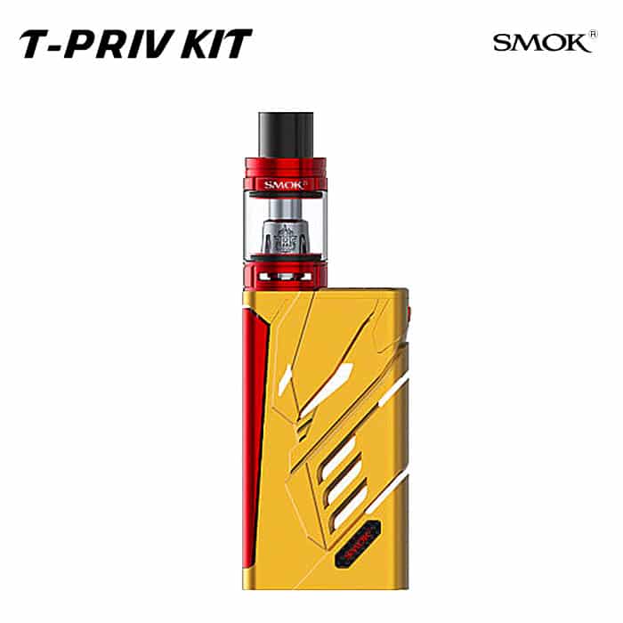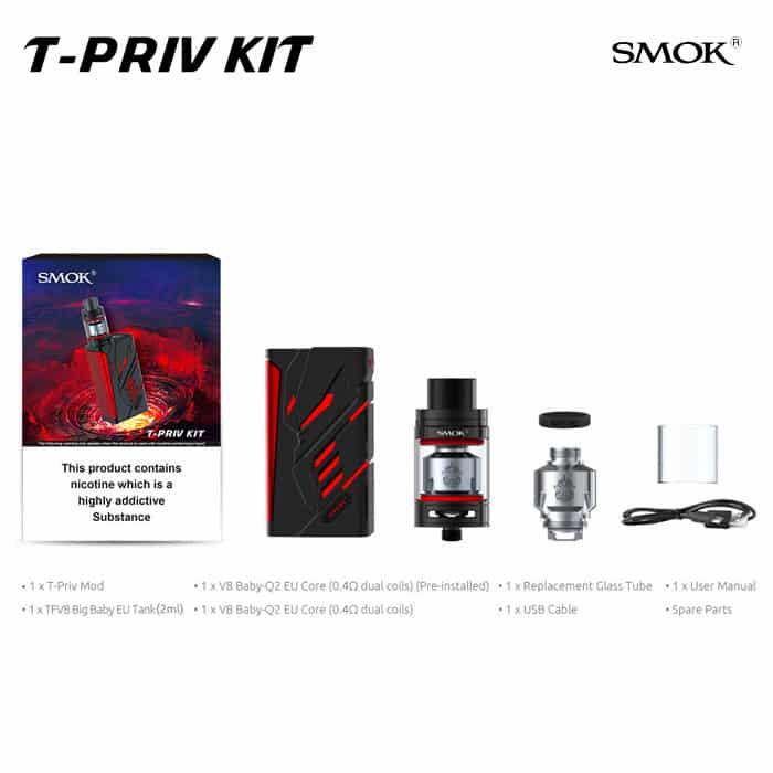 SMOK T-Priv Kit kommer med en T-Priv TC Mod och en TFV8 Big Baby EU Tank. Den har en stor avfyrningsknapp och justerbar LED-belysning i olika färger. T-Priv ger upp till 220W och drivs av 2 st 18650 batterier (köpes separat här). TFV8 Big Baby tanken är 24,5 mm diameter och har 2 ml vätskekapacitet med justerbart luftflöde och top fill.
