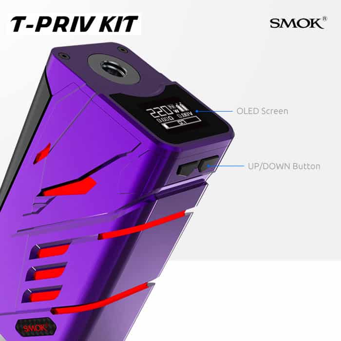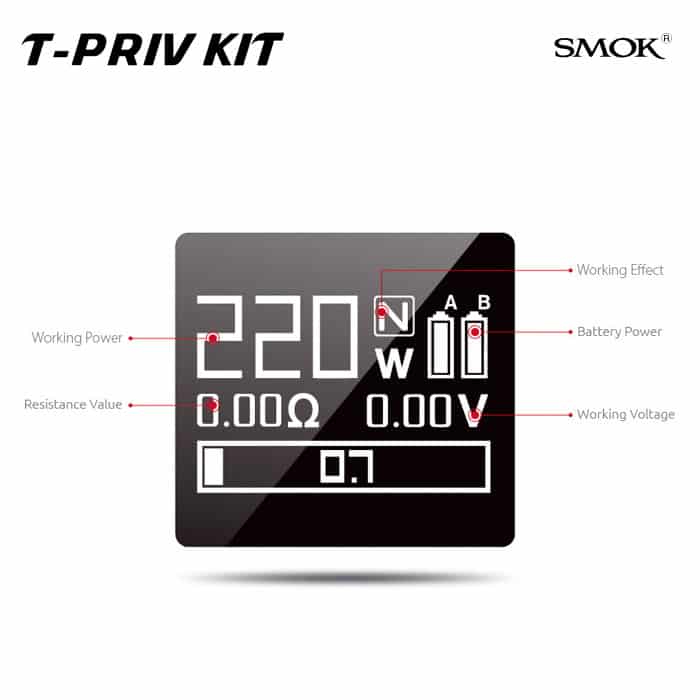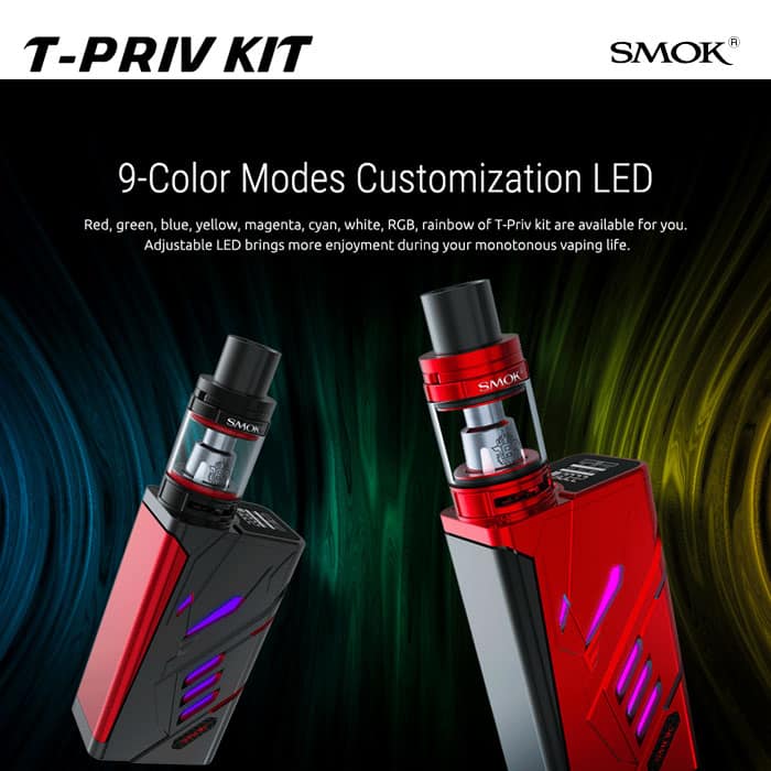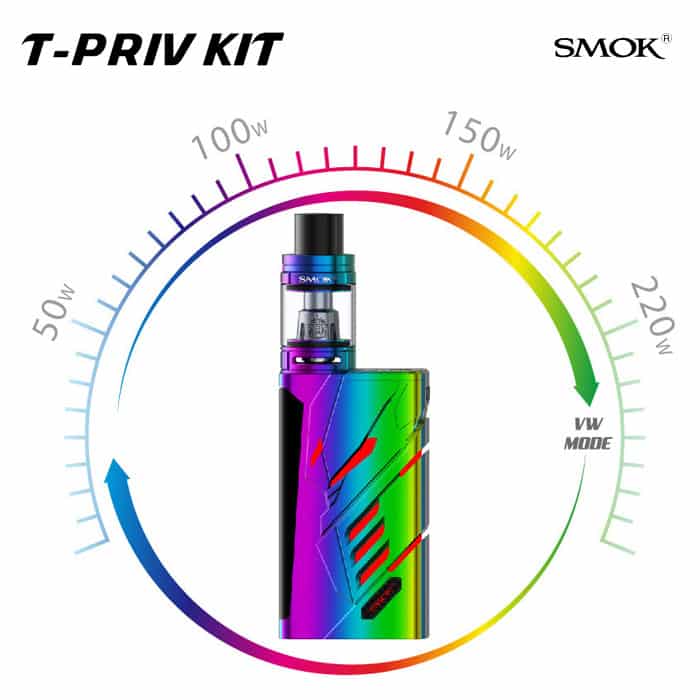 SMOK T-Priv Kit med justerbar LED-belysning. En mod som ger upp till 220W och en tank som ger dig 2 ml vätskekapacitet (upp till 4 ml med adapter).