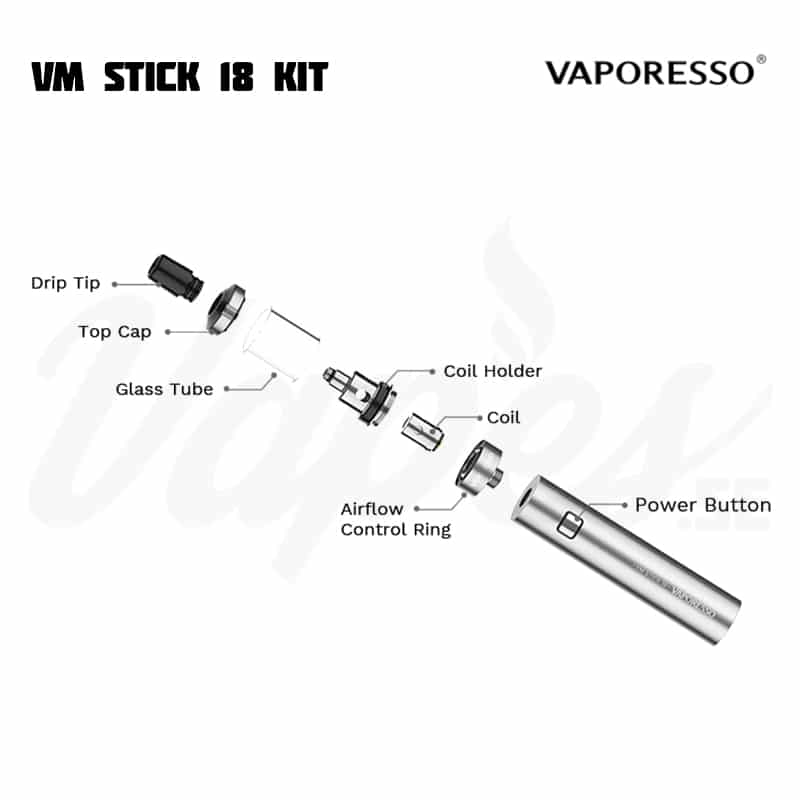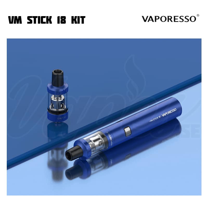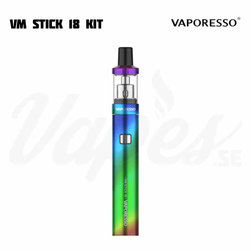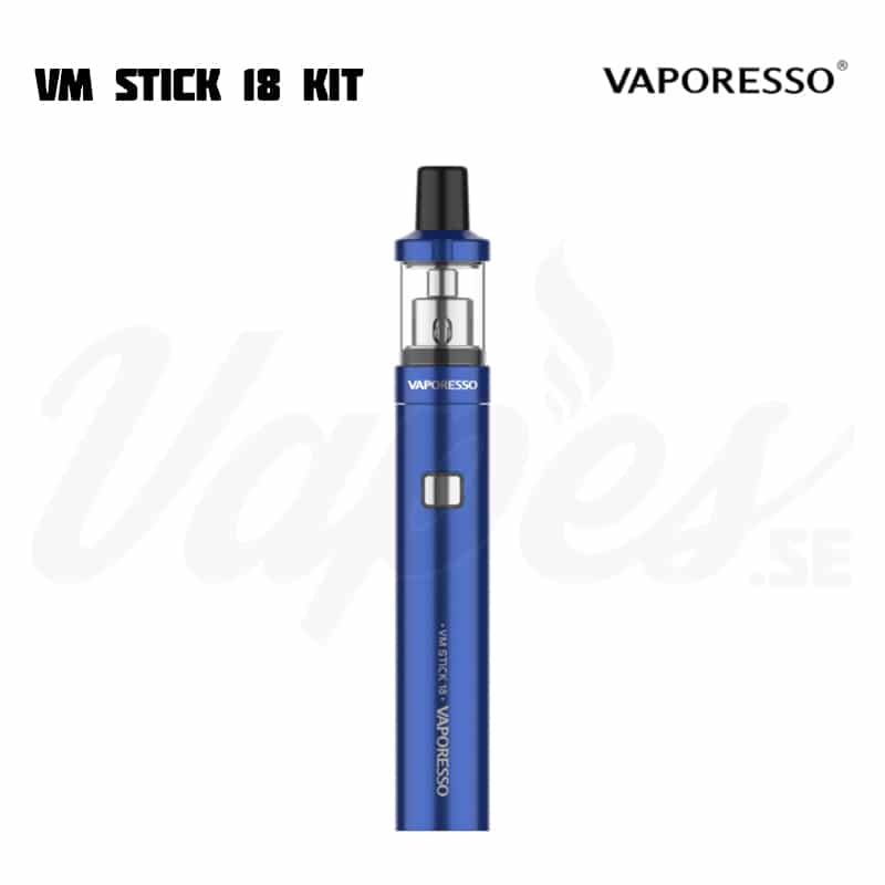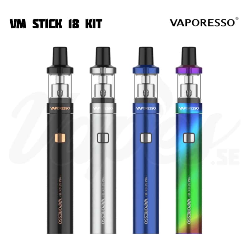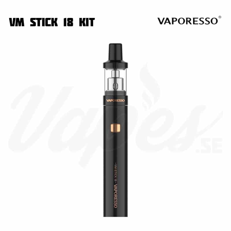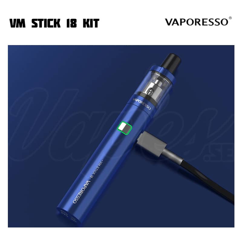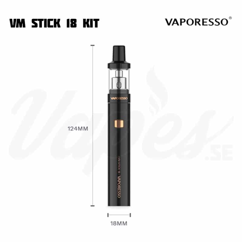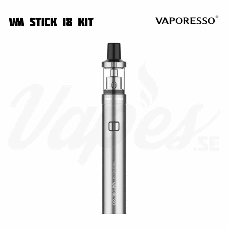 Vaporesso VM Stick 18 Kit är en e-cigarett i pennformat med helt automatiska inställningar. VM 18 tanken rymmer 2 ml vätska, har ett justerbart luftflöde och fylls på genom att skruva av topplocket. Batteriet har en kapacitet på 1200 mAh batteri som räcker en dag vid normal användning. Laddning sker via medföljande kabel och laddning från tomt batteri till fullt går på 60 minuter. VM 18 Stick Kit är 124 mm hög och 18 mm diameter, vilket gör att den lämpar sig mycket väl för den som söker en mindre e-cigarett.