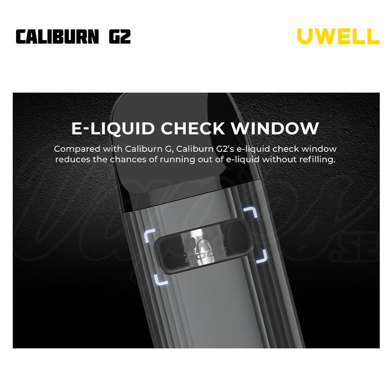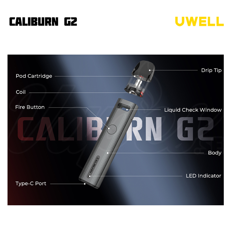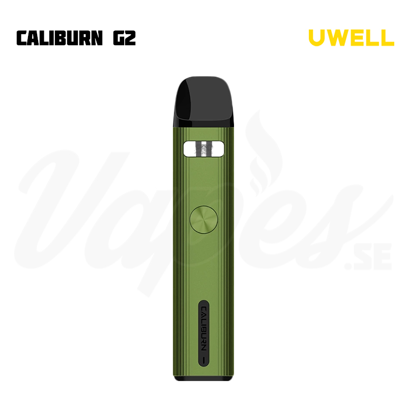 Uwell Caliburn G2 är ett kompakt podsystem med utbytbara- & påfyllningsbara poddar som rymmer 2 ml e-juice. För att förånga kan du antingen hålla inne avfyrningsknappen – eller inhalera direkt via munstycket för att automatiskt förånga. Det inbyggda batteriet har 750 mAh kapacitet och laddning sker via USB C. Enheten är utrustad med ett litet fönster för att kunna kontrollera vätskenivå utan att behöva ta ur podden. G2 är kompatibel med samtliga Caliburn G & G2 coils.