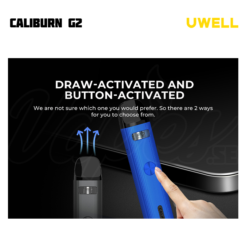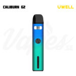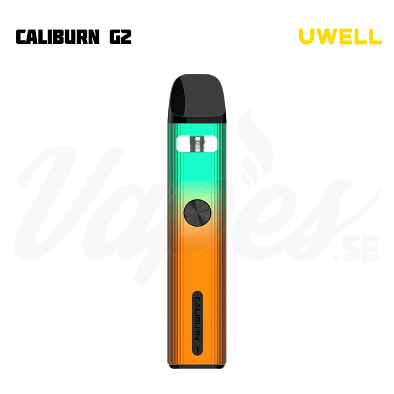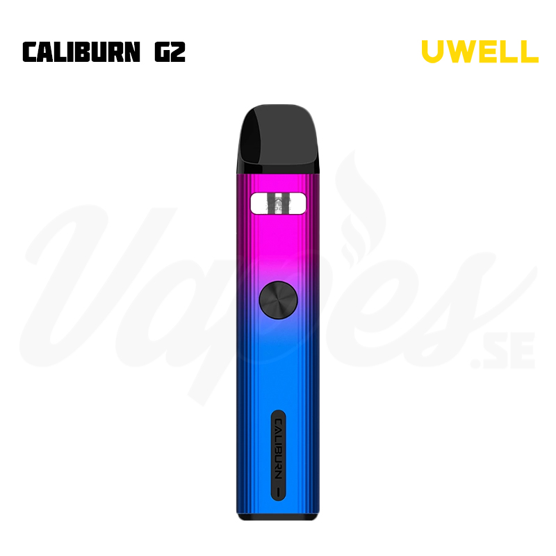 Uwell Caliburn G2 är ett kompakt podsystem med utbytbara- & påfyllningsbara poddar som rymmer 2 ml e-juice. För att förånga kan du antingen hålla inne avfyrningsknappen – eller inhalera direkt via munstycket för att automatiskt förånga. Det inbyggda batteriet har 750 mAh kapacitet och laddning sker via USB C.