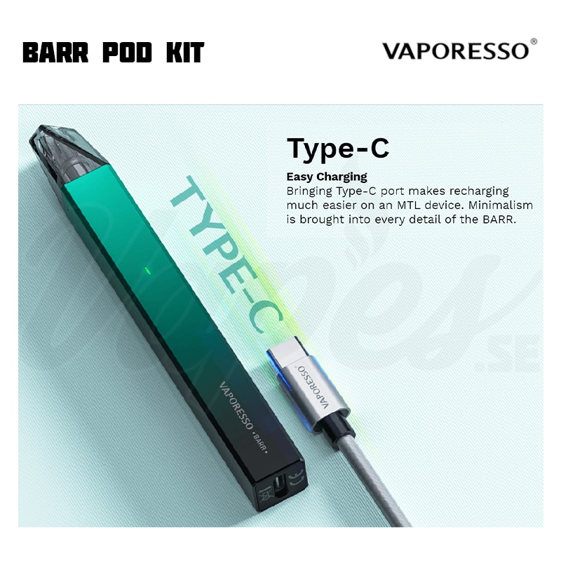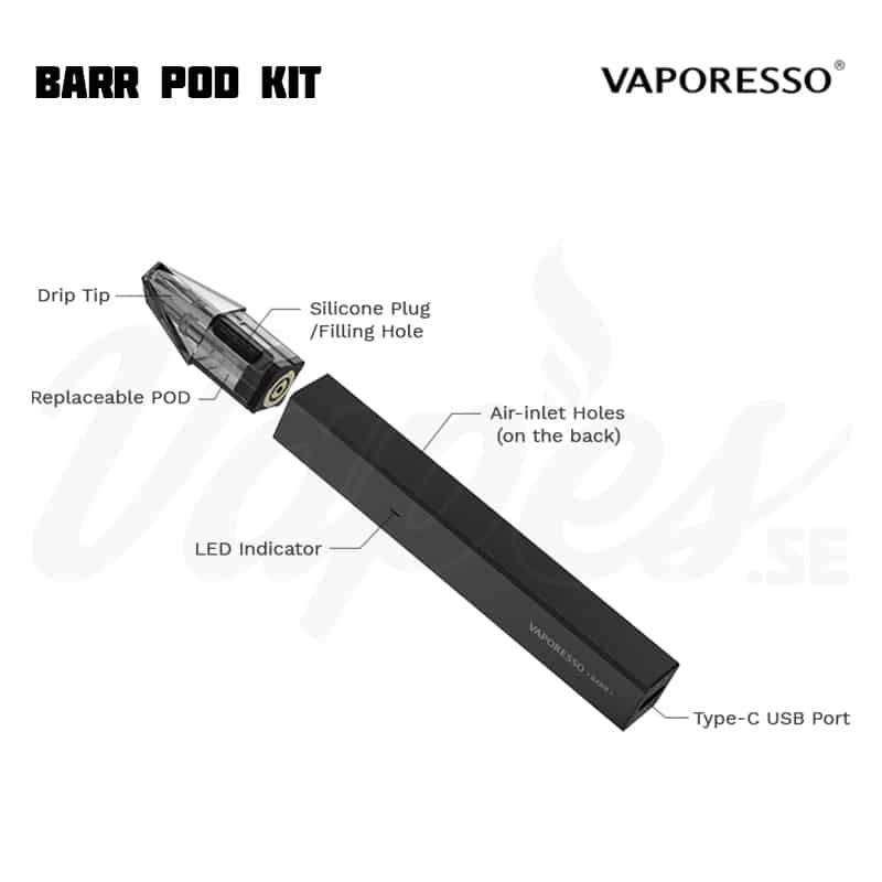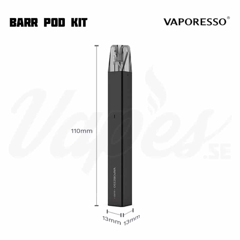 Vaporesso BARR är ett kompakt och modernt MTL podsystem i litet format, med automatiska inställningar och avancerad teknik. För att använda BARR fyller du på podden, låter stå i 15 minuter första gången (så att bomullen återfuktas) och sedan inhalerar du bara via munstycket – inga knapptryck eller inställningar krävs.