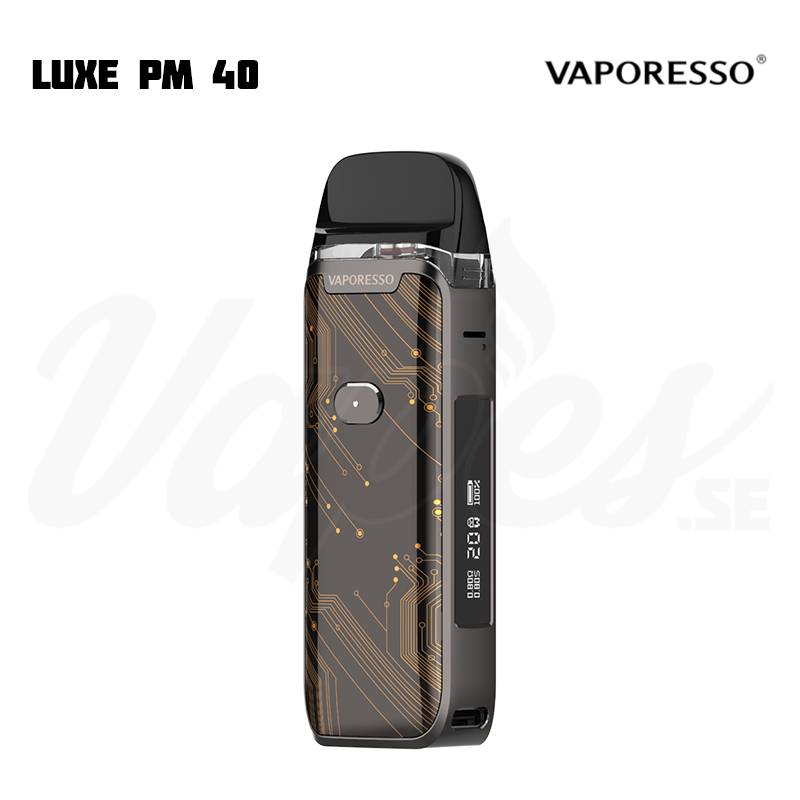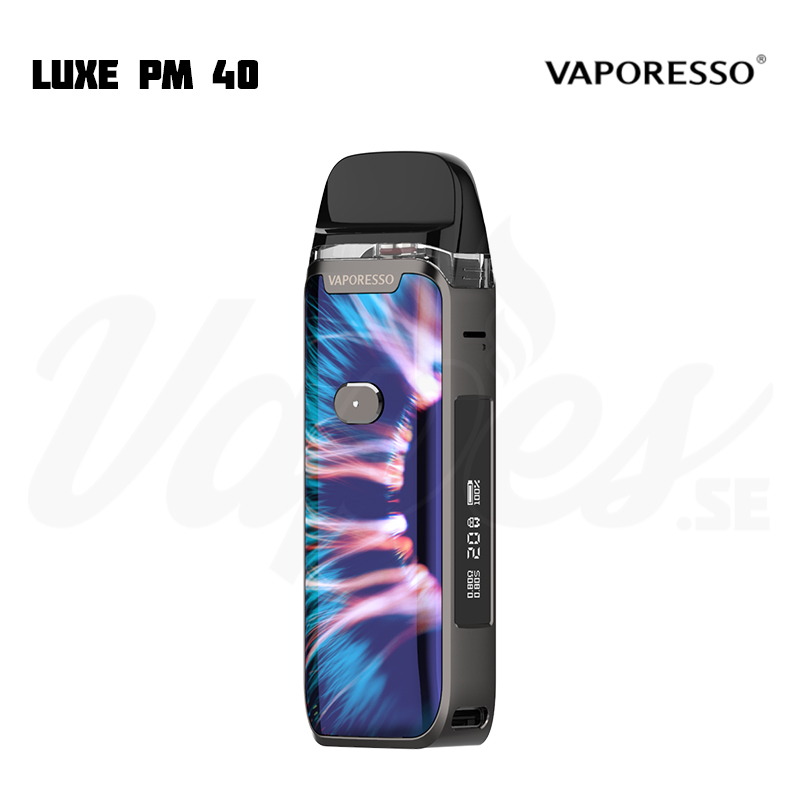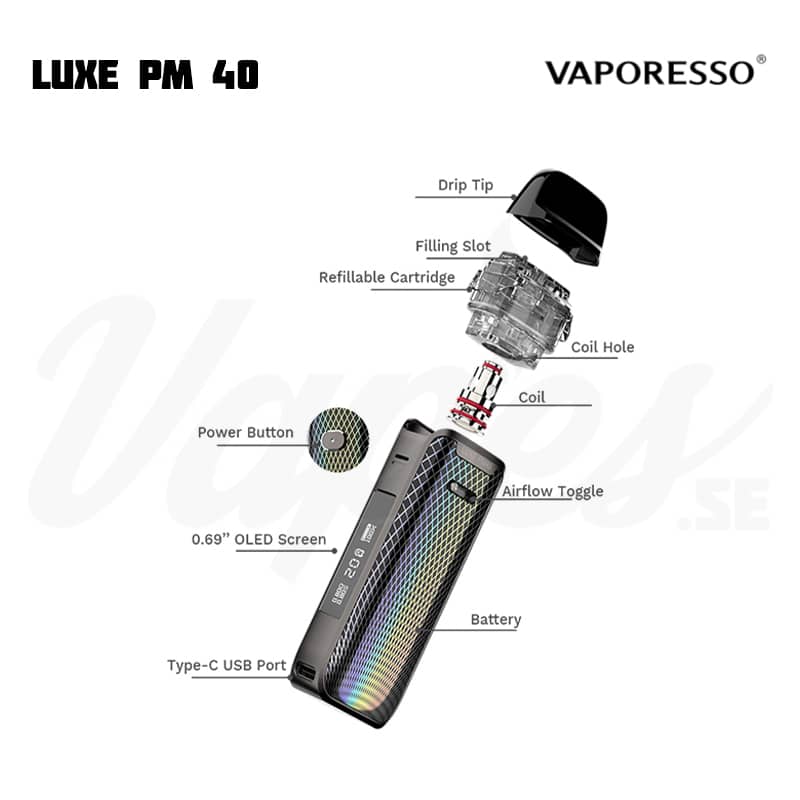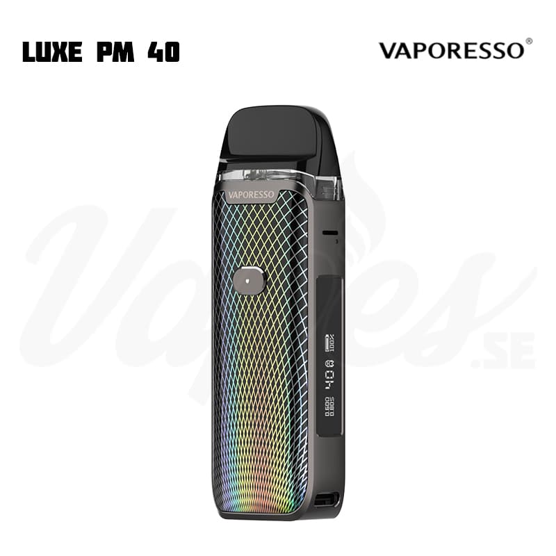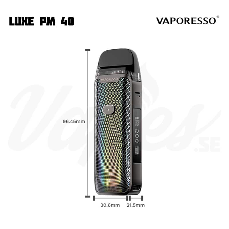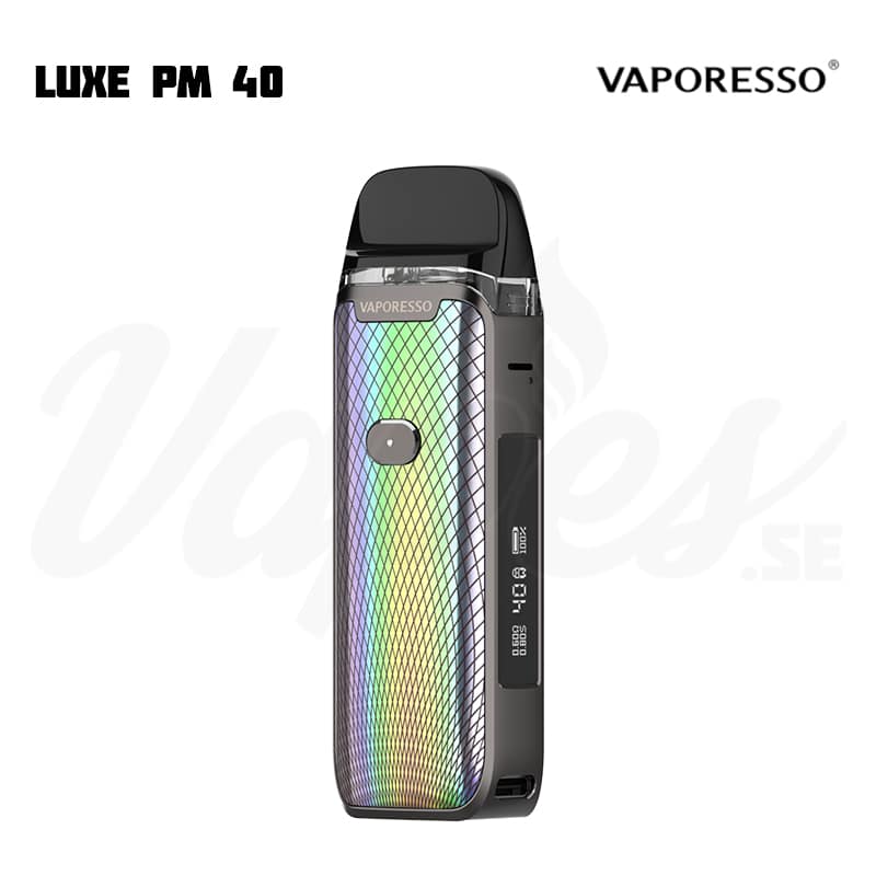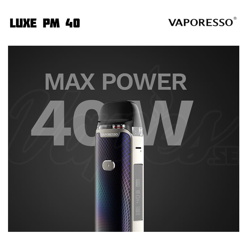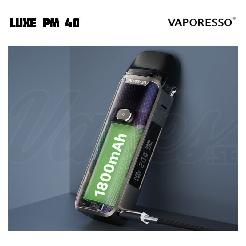 Vaporesso LUXE PM40 är ett kompakt pod vape kit med 4 ml vätskekapacitet och 1800 mAh batteri som räcker hela dagen vid normal användning. Valbar Watt mellan 5–40 W går att ställa in via gränssnittet. Snabbladdning sker via USB C (kabel medföljer). Podden som rymmer 4 ml e juice har en synlig vätskebehållare och en design som motverkar läckage. Coils är utbytbara i LUXE PM40 poddarna och tillhör den breda GTX coil-serien.