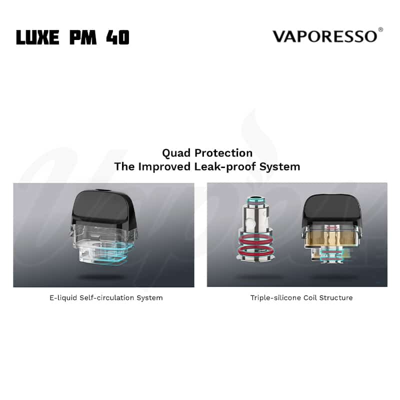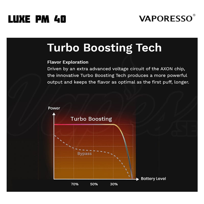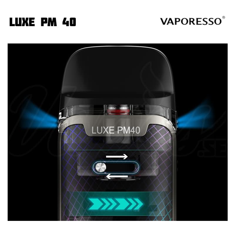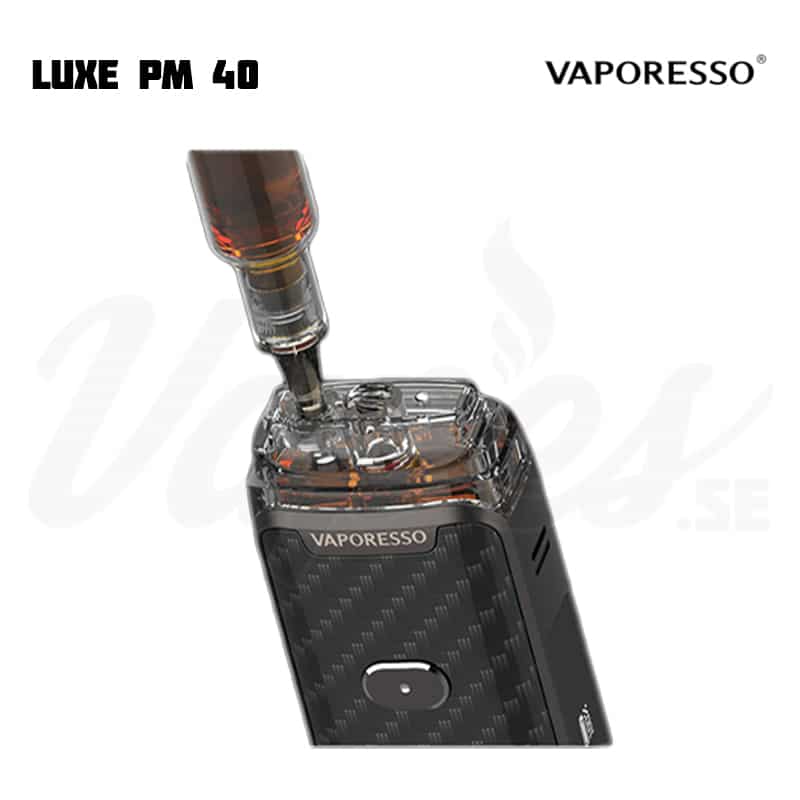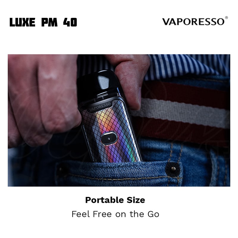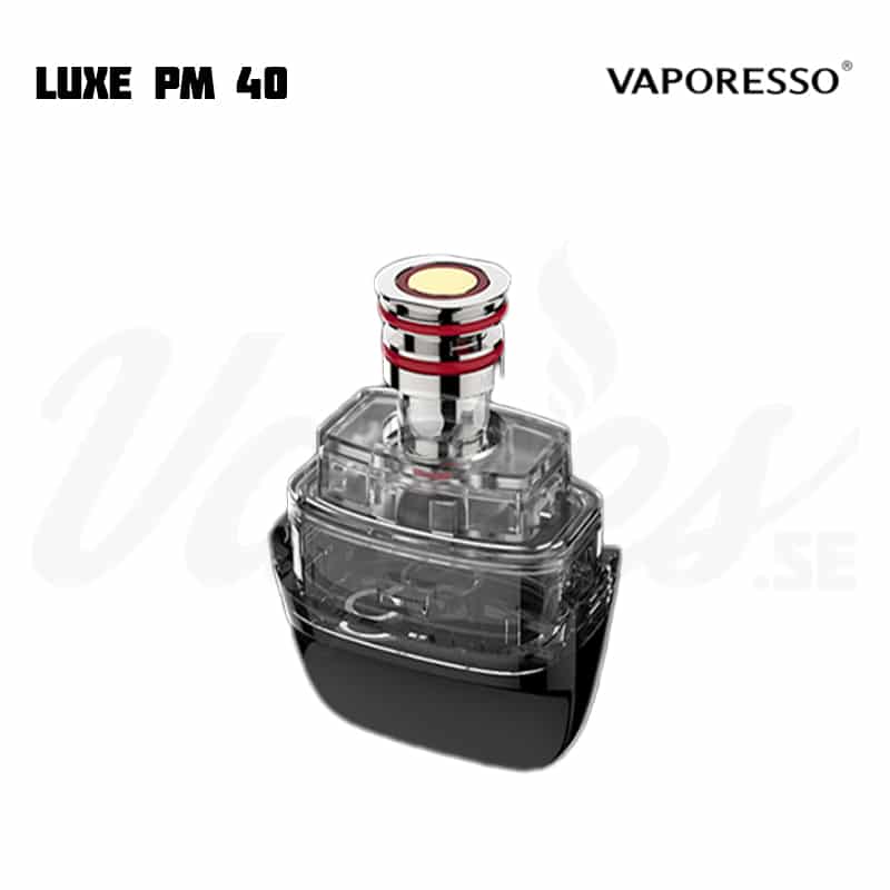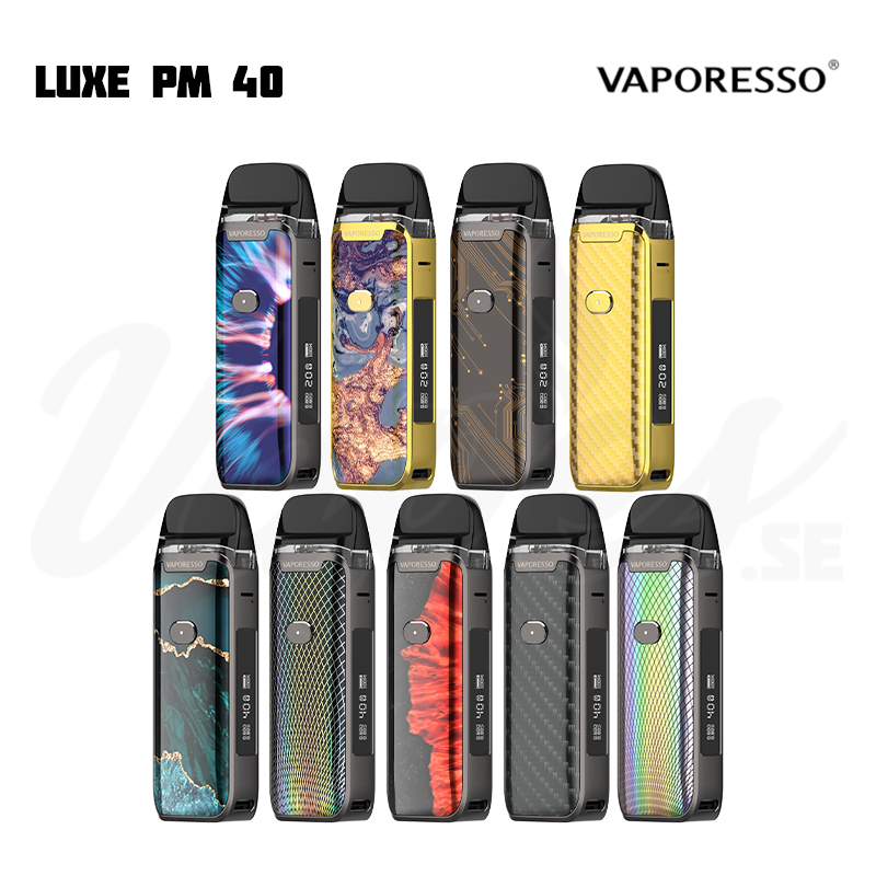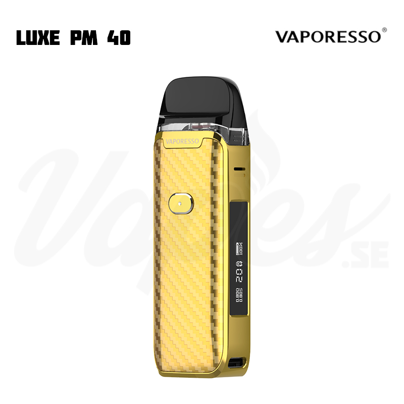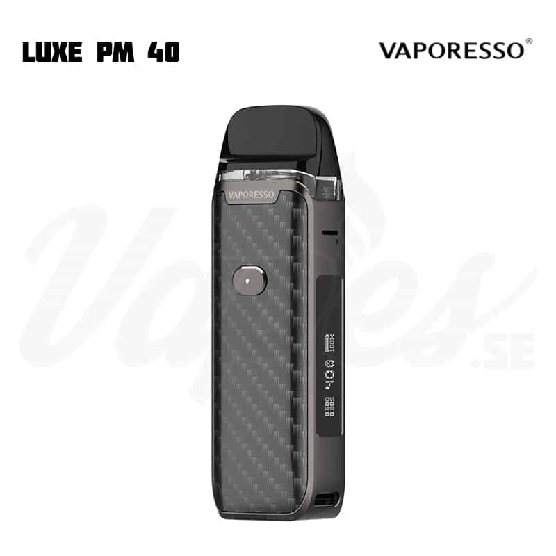 Vaporesso LUXE PM40 är ett kompakt pod vape kit med 4 ml vätskekapacitet och 1800 mAh batteri som räcker hela dagen vid normal användning. Valbar Watt mellan 5–40 W går att ställa in via gränssnittet. Snabbladdning sker via USB C (kabel medföljer). Podden som rymmer 4 ml e juice har en synlig vätskebehållare och en design som motverkar läckage. Coils är utbytbara i LUXE PM40 poddarna och tillhör den breda GTX coil-serien.