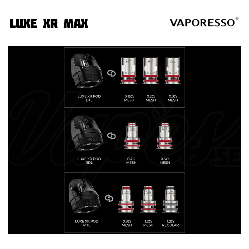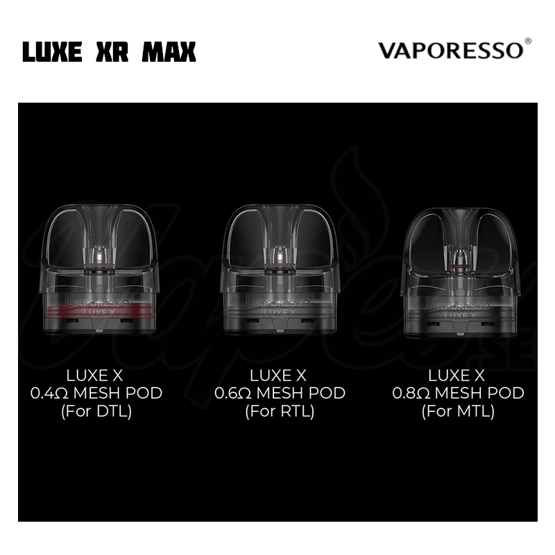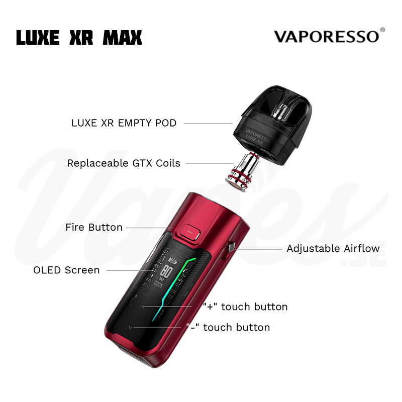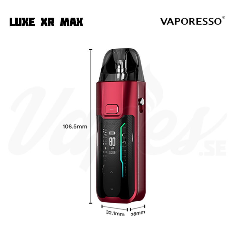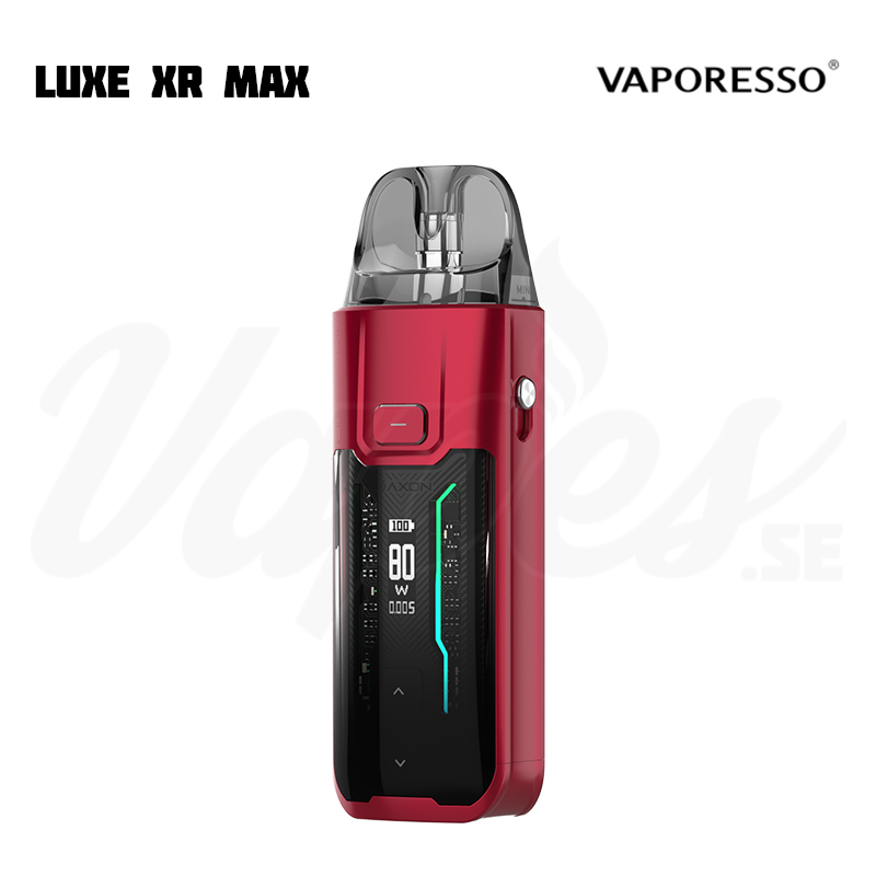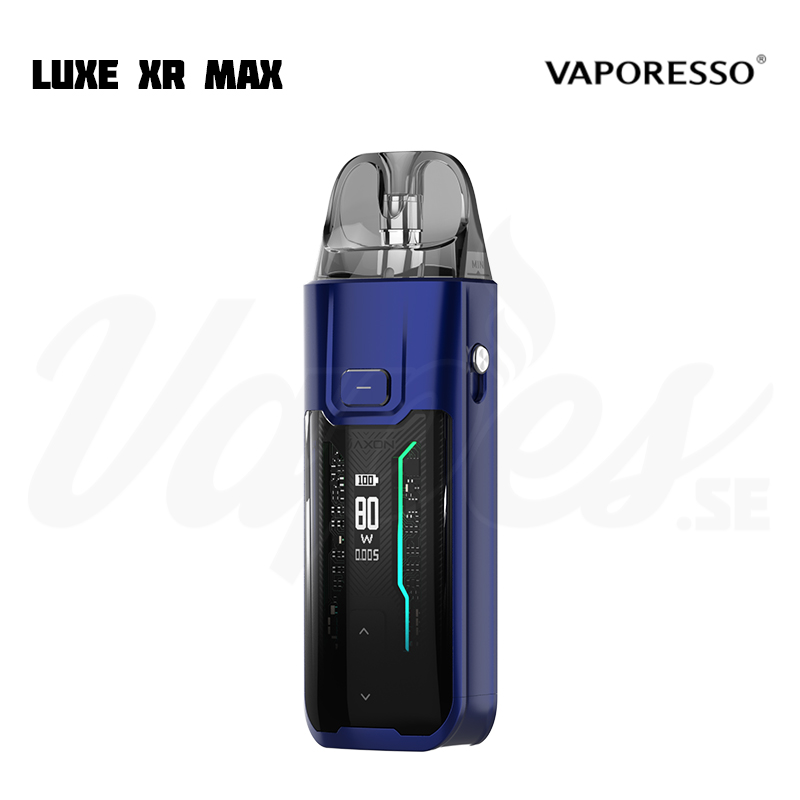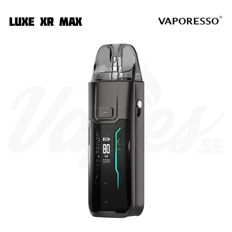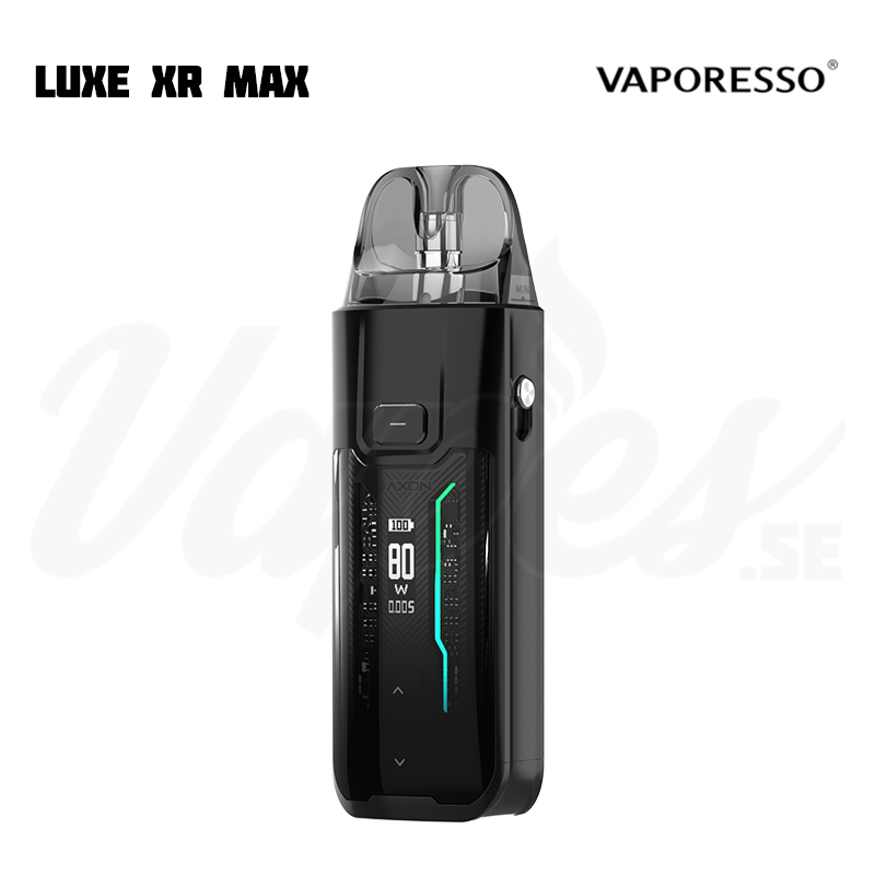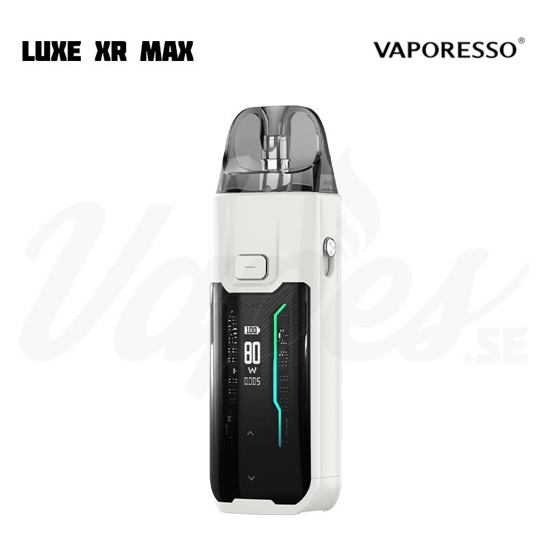 Vaporesso LUXE XR MAX är Vaporessos senaste podsystem i LUXE-serien som går upp till 80 W och har ett inbyggt batteri på 2800 mAh som laddas via USB C (sladd medföljer). Justera Watt och se batterinivå på OLED-skärmen, som kommer med touchstyrning. På sidan av enheten kan du justera luftflödet. Med LUXE XR MAX kommer du kunna välja mellan DL/DTL, RDL och MTL (RDL & MTL pod/coil säljes separat). Det medföljer en DL -podd – samt två coils: 0,2 ohm MESH och 0,4 ohm MESH. Båda rekommenderas för 70VG e-juice.