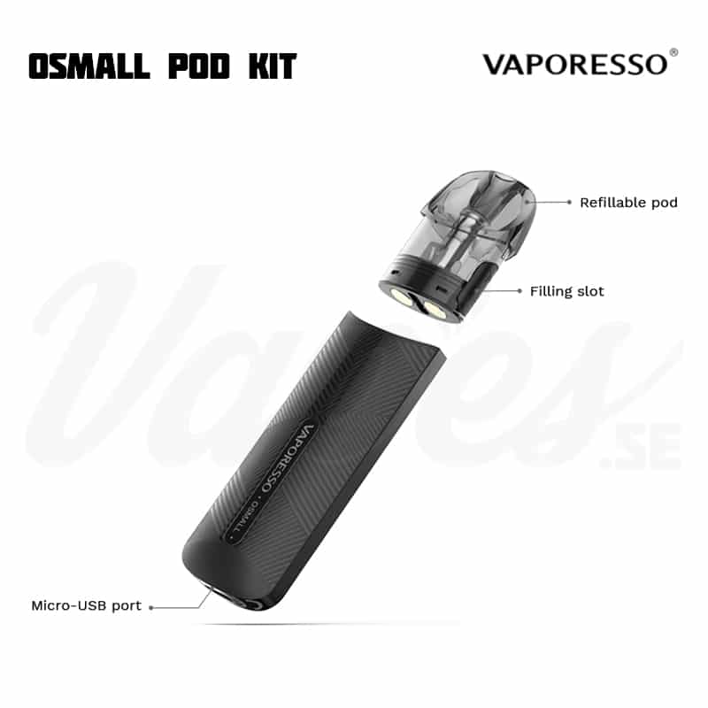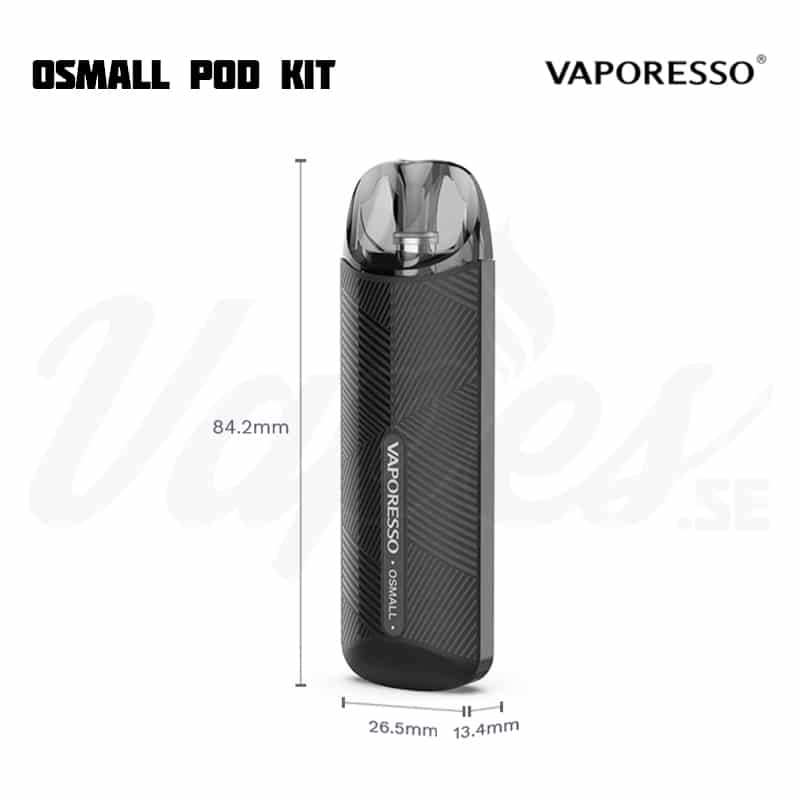 Vaporesso OSMALL är ett kompakt och lättviktigt podsystem som låter användaren vejpa utan att behöva bry sig om inställningar. Poddarna rymmer 2 ml vätska och innehåller en 1,2 ohm coil. Batteriets kapacitet är på 350 mAh och laddas via Micro USB-kabel (medföljer). Avfyrningen sker automatiskt via inhalering och är anpassat för dig som ska eller redan har slutat röka. Denna e-cigarett har ett luftflöde anpassat för MTL (mun-till-lunga), som ger ett tightare luftintag med mindre men tjockare ånga. 1,2 ohm coilsen innehåller en ny sorts bomull baserad på linfrö, som fokuserar på längre livslängd och renare smaker.