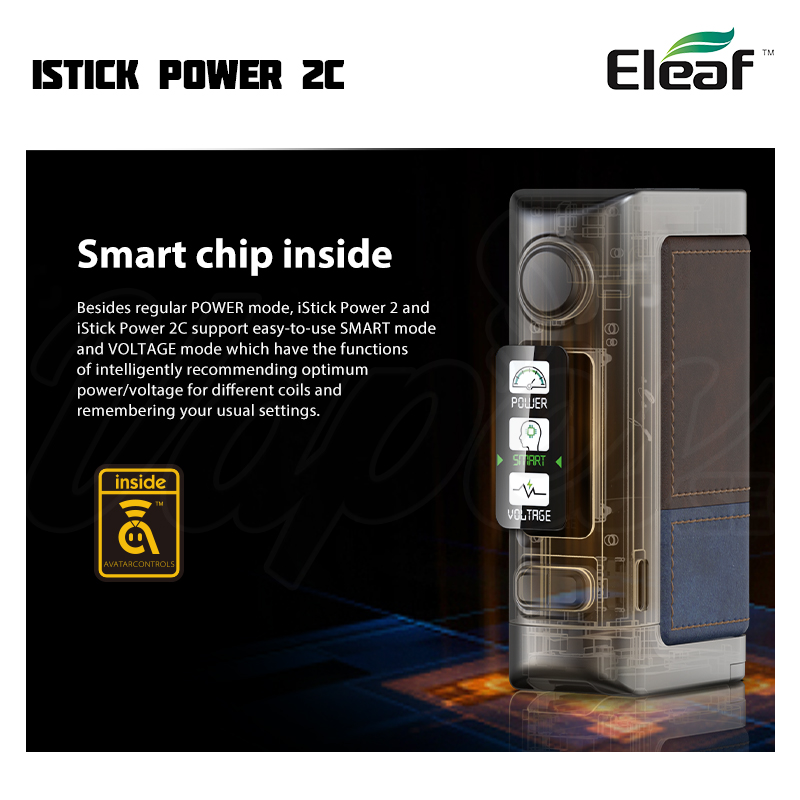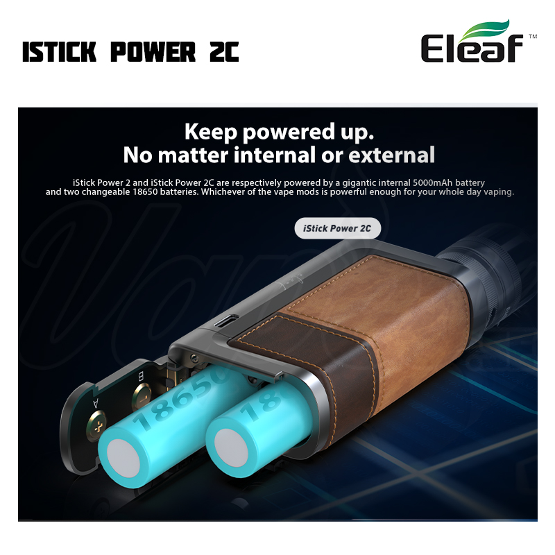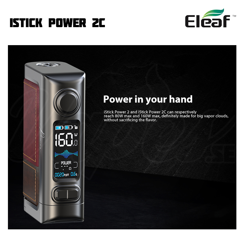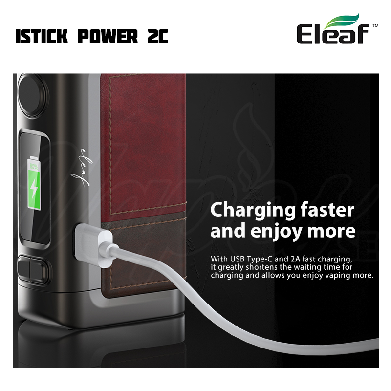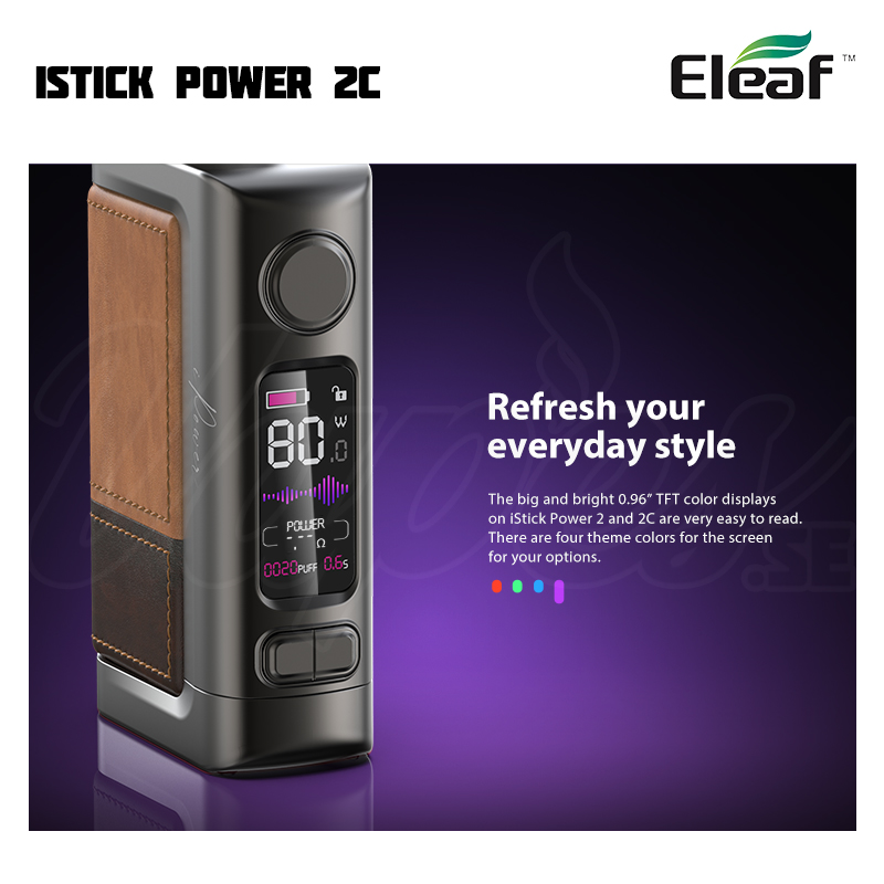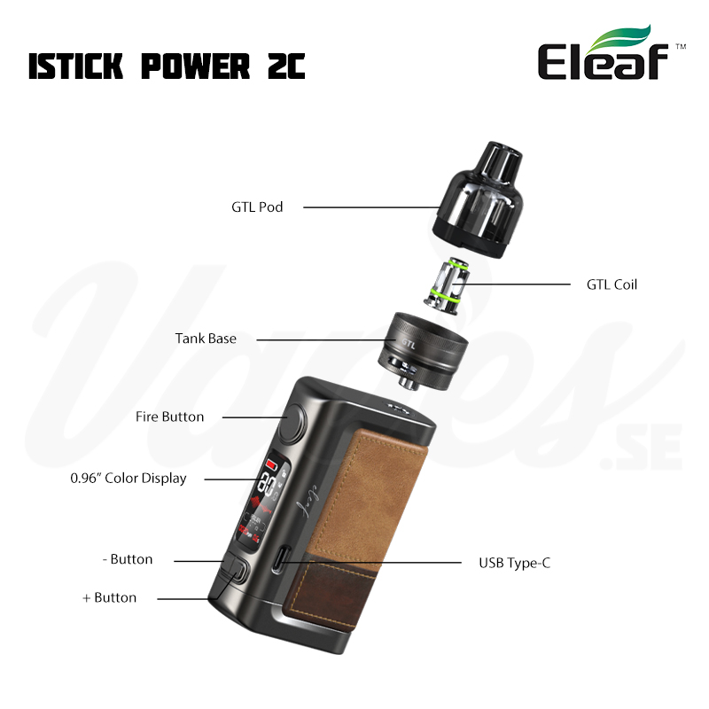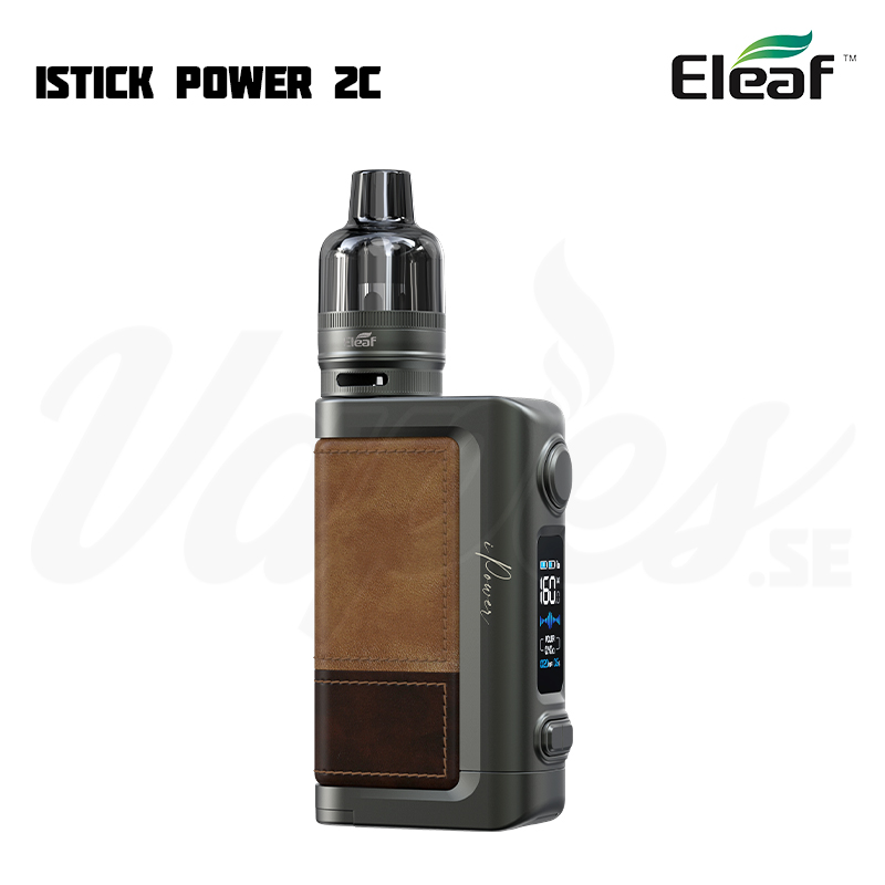 Eleaf iStick Power 2C Kit går upp till 160 W och drivs av två externa 18650-batterier (köpes separat). Kittet inkluderar Eleaf GTL Pod Tank, som är en 4,5 ml tank i podformat, som stödjer alla Eleaf GTL coils. Med USB C och 2A laddning laddar du snabbt upp batterierna direkt i enheten. Den 0,96″ stora färgskärmen visar allt du behöver för att se och justera inställningar. Du kan även byta färgtema på gränssnittet, vilket låter dig personifiera den.