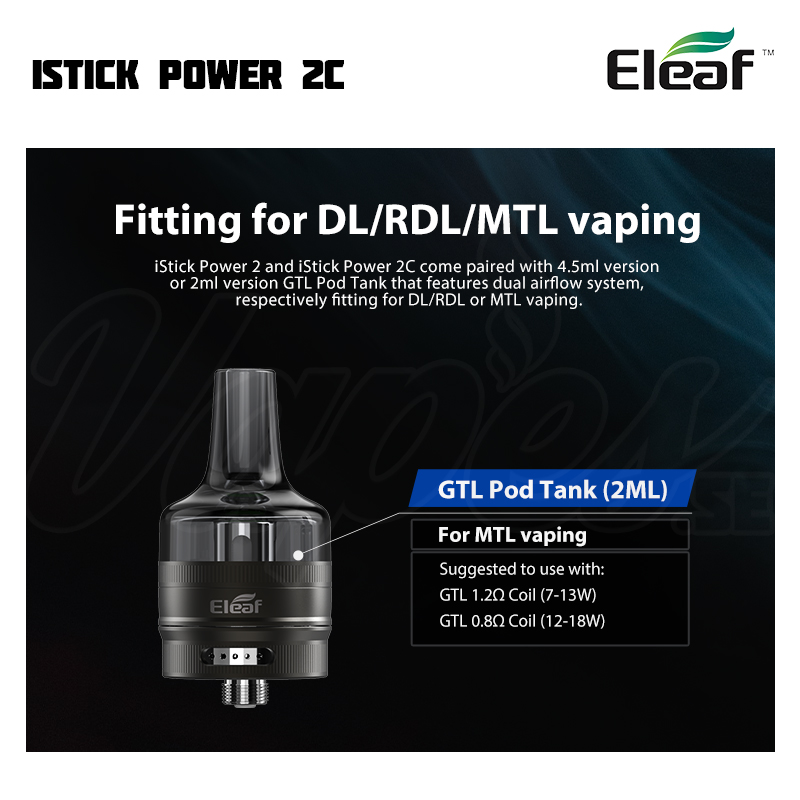 Om du föredrar öppet luftflöde (DL & RDL), rekommenderar vi att använda medföljande Eleaf GTL Pod Tank (4,5 ml), tillsammans med de medföljande GTL 0,4 ohm eller GTL 0,8 ohm coilsen.