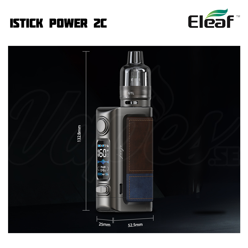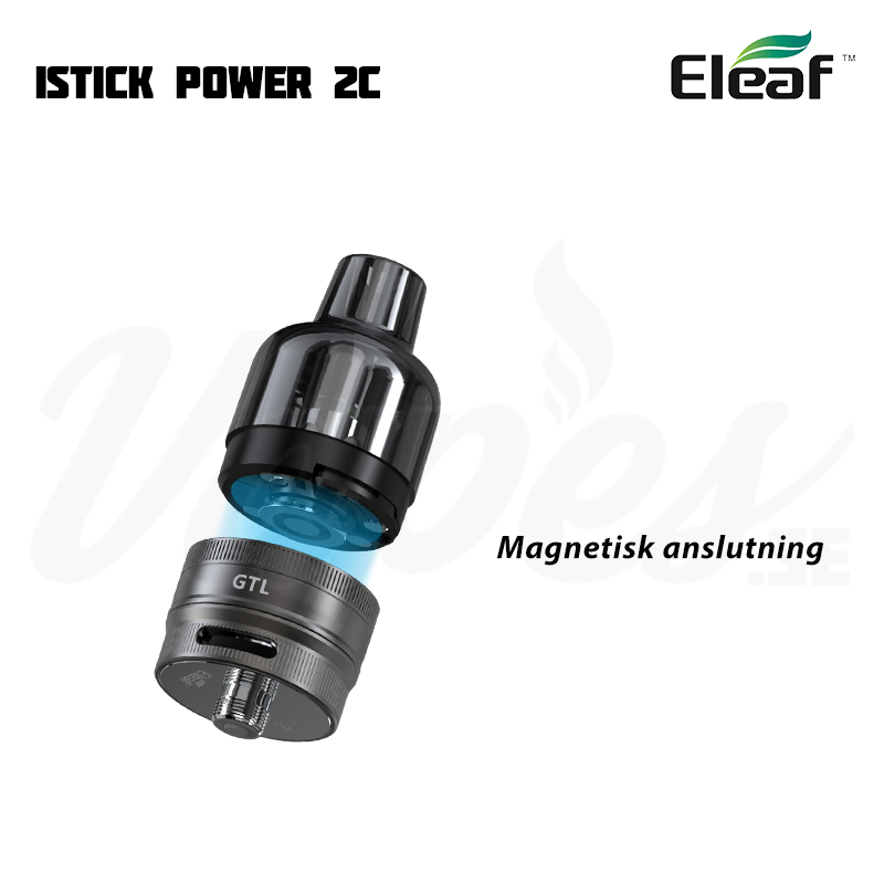 Eleaf iStick Power 2C Kit går upp till 160 W och drivs av två externa 18650-batterier (köpes separat). Kittet inkluderar Eleaf GTL Pod Tank, som är en 4,5 ml tank i podformat, som stödjer alla Eleaf GTL coils. Tanken har en vanlig 510-gänga, med magnetansluten pod och justerbart luftflöde. Med USB C och 2A laddning laddar du snabbt upp batterierna direkt i enheten. Den 0,96″ stora färgskärmen visar allt du behöver för att se och justera inställningar. Du kan även byta färgtema på gränssnittet, vilket låter dig personifiera den.