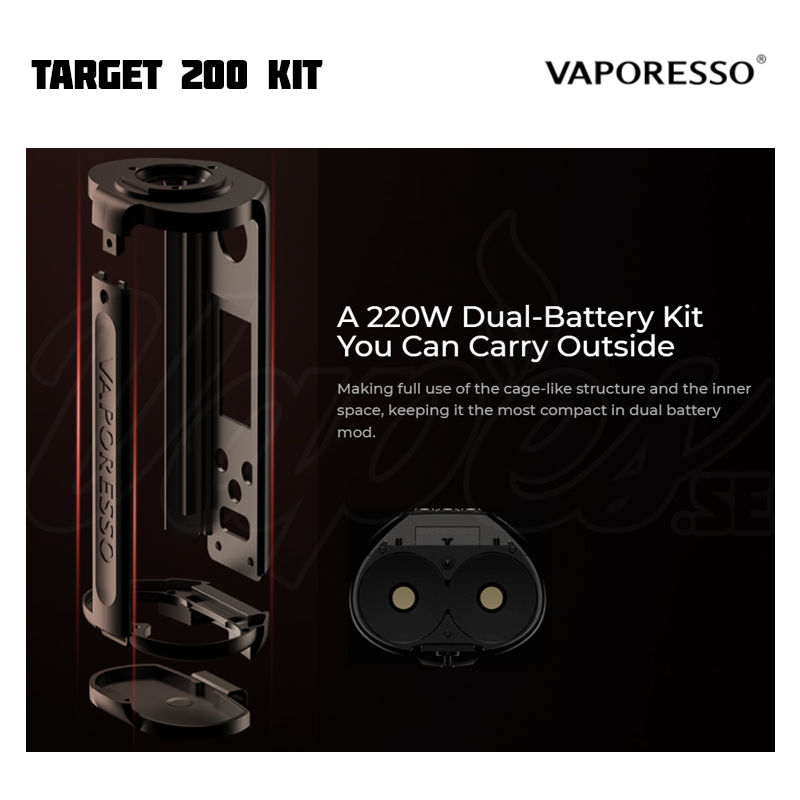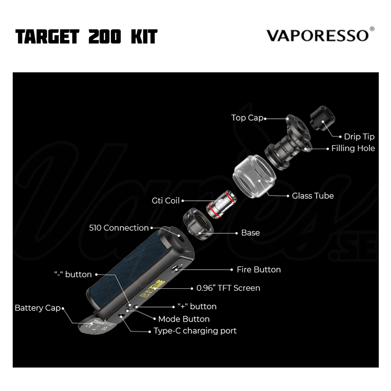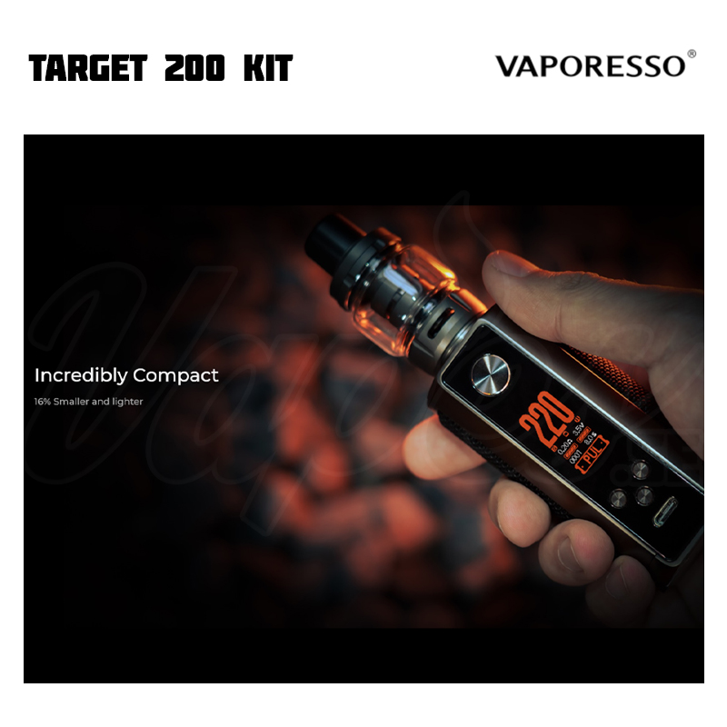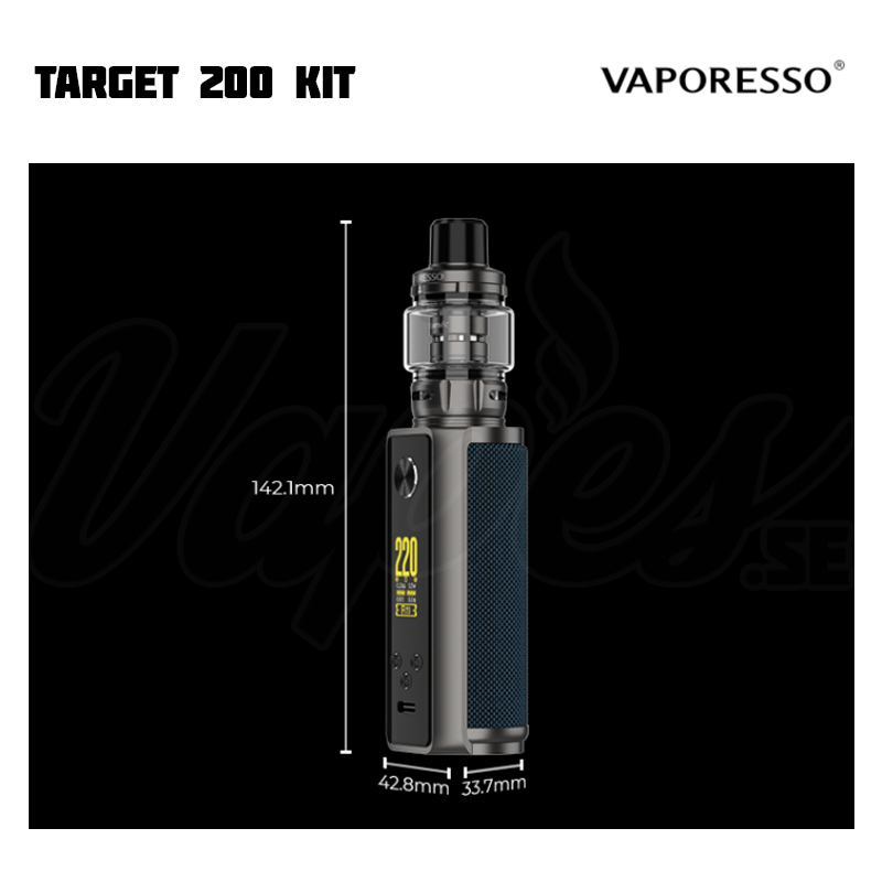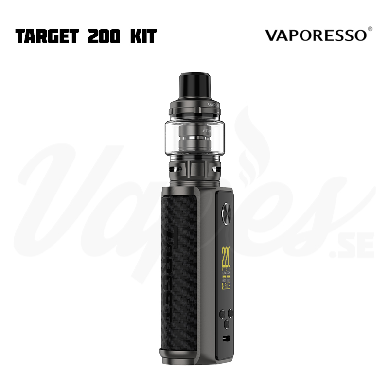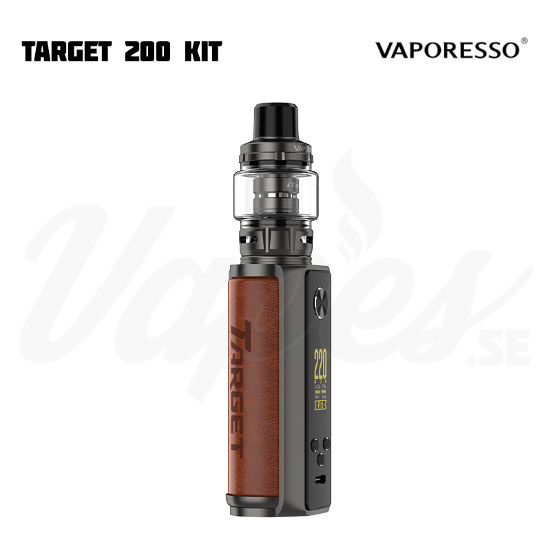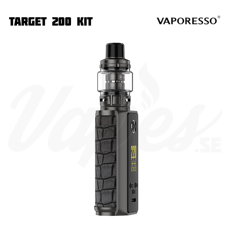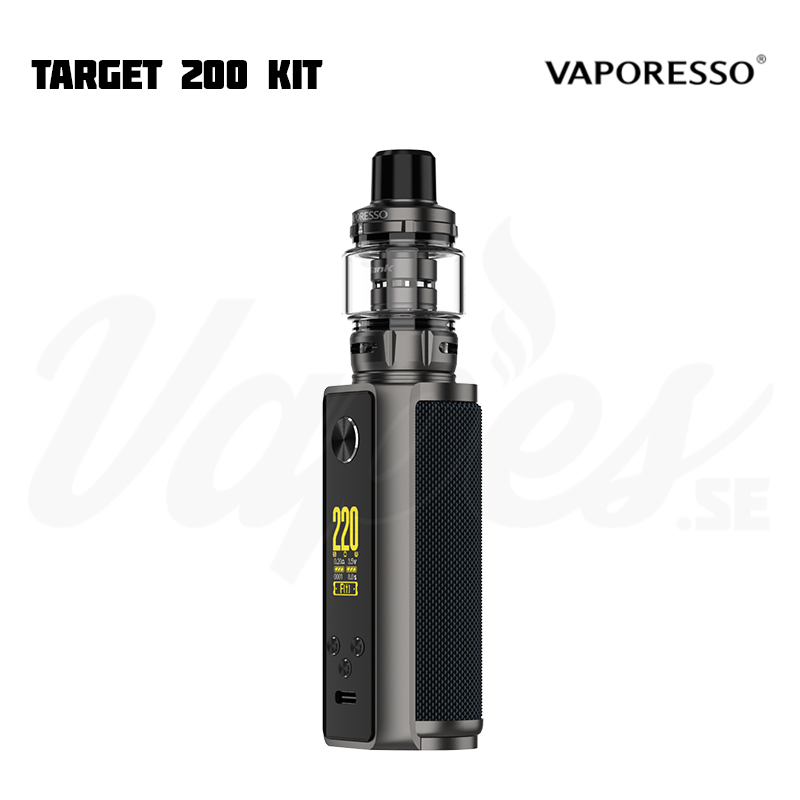 Vaporesso TARGET 200 Kit är en vape bestående av Vaporesso TARGET 200 Mod och Vaporesso iTank. Modden går upp till 200 W och drivs av två stycken 18650 batterier (köpes separat). Laddning sker via USB C och en kabel för laddning medföljer. Den medföljande tanken – Vaporesso iTank, rymmer 8 ml e-juice, fylls på via ett skjutbart topplock och använder sig av GTi-coils som du trycker in i basen istället för att skruva i dem. Medföljande coils är GTi 0.2Ω MESH Coil (60-75W) samt GTi 0.4Ω MESH Coil (50-60W).