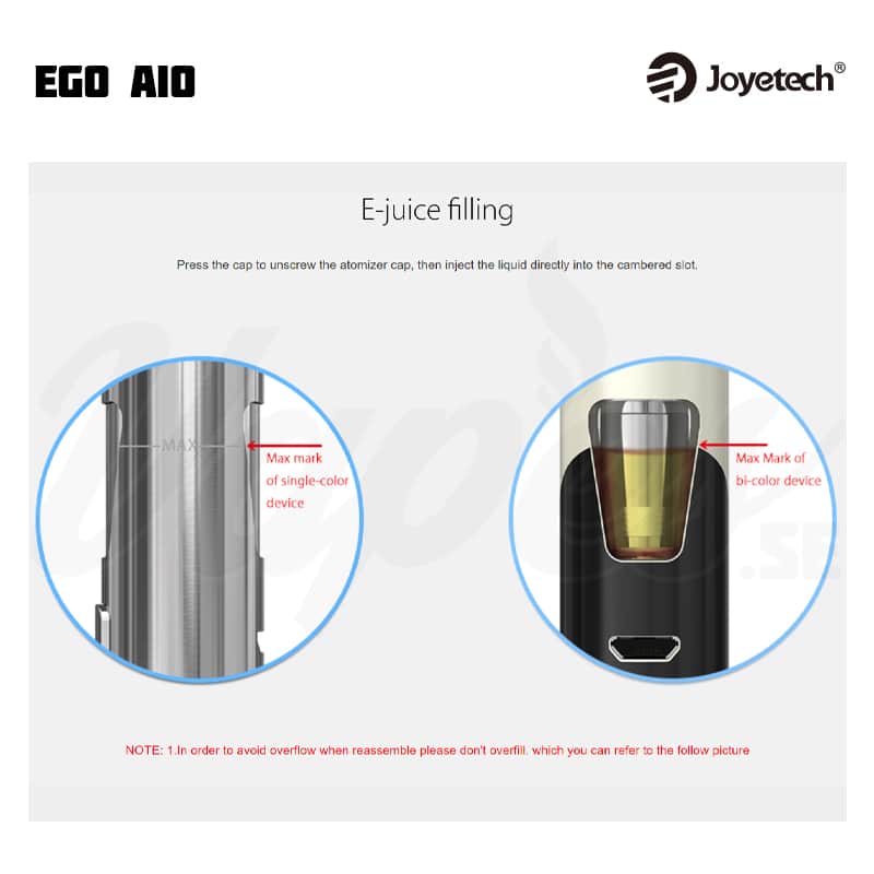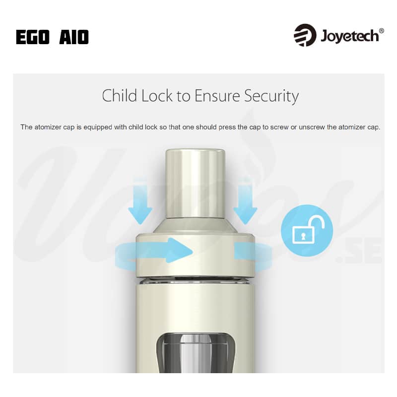 Tanken har ett barnlås som gör att barn inte kommer åt e-juicen som är i tanken. Munstycket (drip tip) är spiralformat på insidan för att kondens inte ska ta sig upp lika lätt. Förutom barnlås & mindre läckage har Joyetech AIO säkerhetsfunktioner så som skydd mot överladdning, kortslutning, överhettning och urladdning.