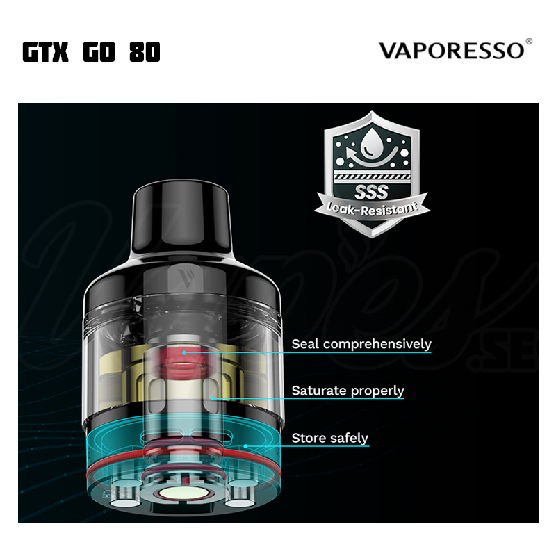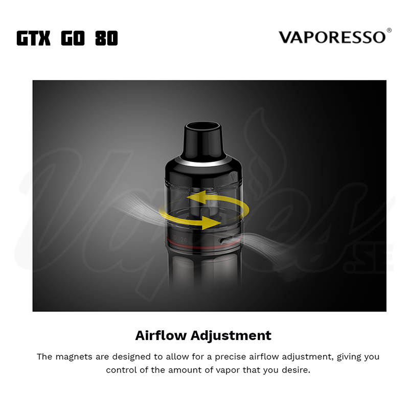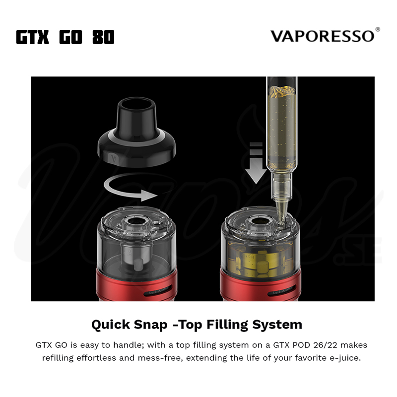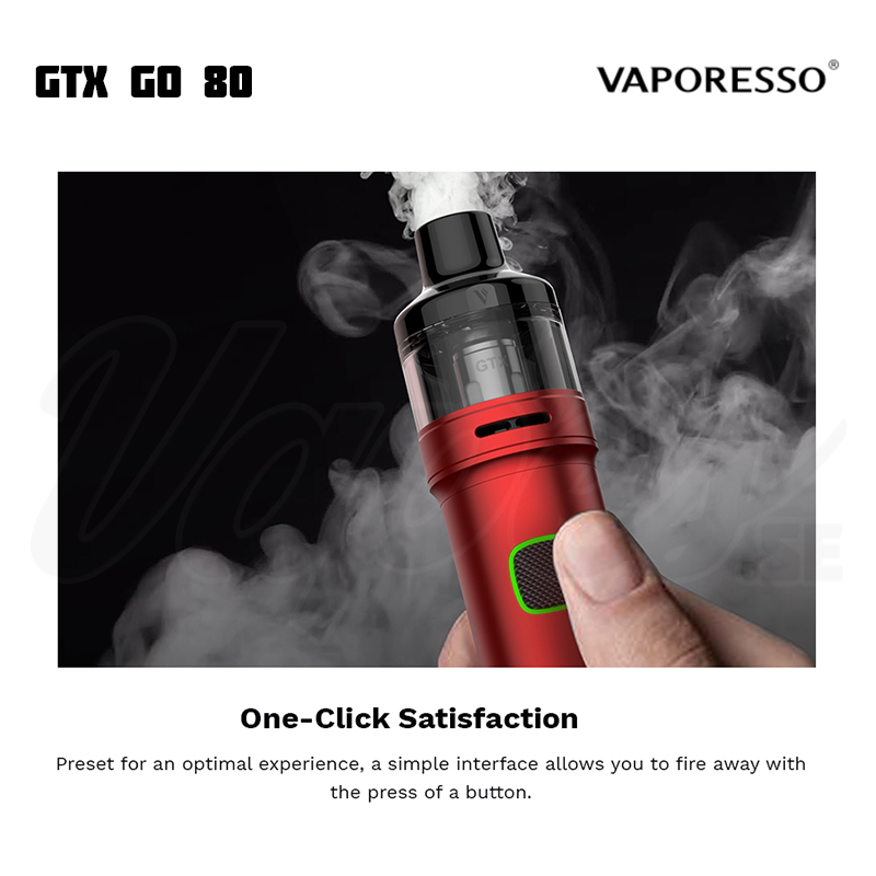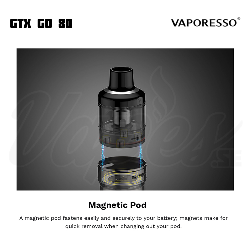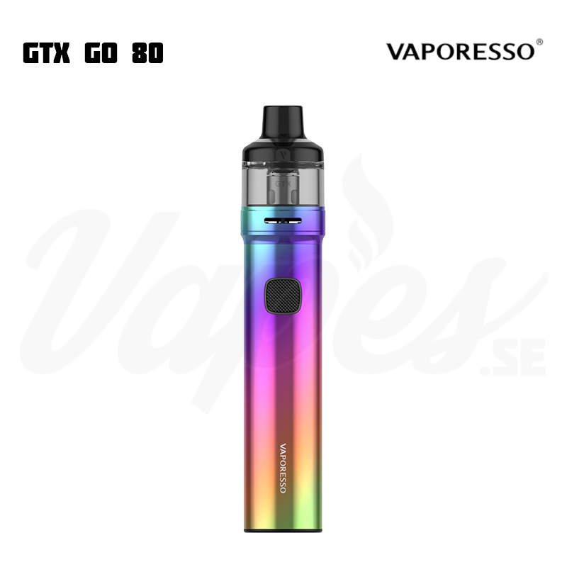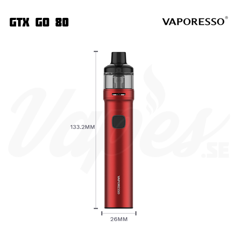 Vaporesso GTX GO 80 är en ny 26 mm diameter pennformad vape från Vaporesso, med en pod som rymmer 5 ml e-juice och fylles på via top fill (skruvbart lock). Det inbyggda batteriet är 3000 mAh och laddas via USB-C. Podden är magnetansluten och genom att vrida på den kan du justera luftflödet. Modden går upp till 80W och anpassar sig automatiskt för de monterade GTX coilsen. Modden anpassar inställningarna automatiskt utefter vilken coil du monterat. Håll batteriet laddat för att få ut max effekt. Medföljande coil är GTX 0,2 ohm Mesh. Moddens Voltomfång är 0-4 V.