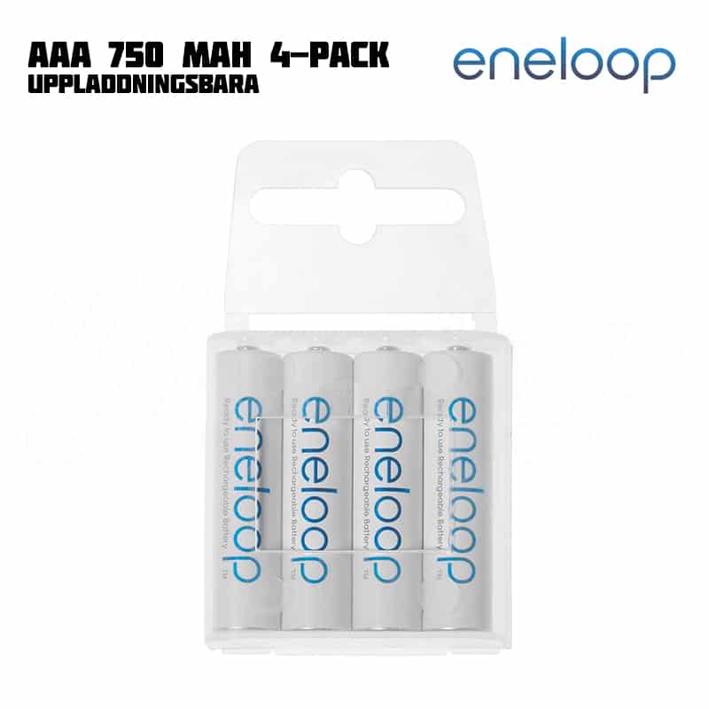 AAA Eneloop 750 mAh batterier i 4-pack som är uppladdningsbara. Vi har tagit in dessa främst för våra vågar (för DIY) men kan självklart användas till annan elektronik som vill använda AAA-batterier. Vi valde att ta in dessa då de kan laddas upp och ur upp till 2100 gånger. När batteriet är nytt går det upp till 800 mAh, men lägsta mAh som det kan ge på full laddning är 750 mAh. En annan fördel med Eneloop’s AAA-batterier är att de fungerar ännu bättre än motståndarna vid lägre temperatur.
