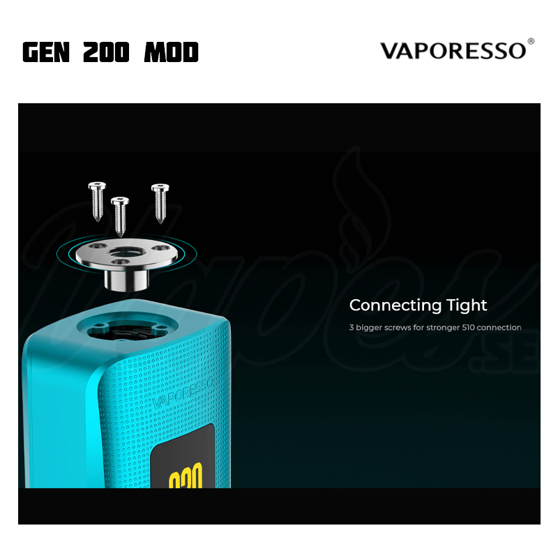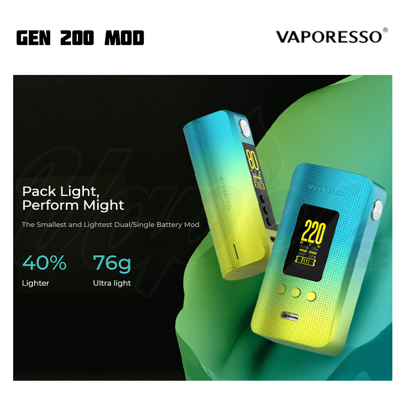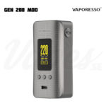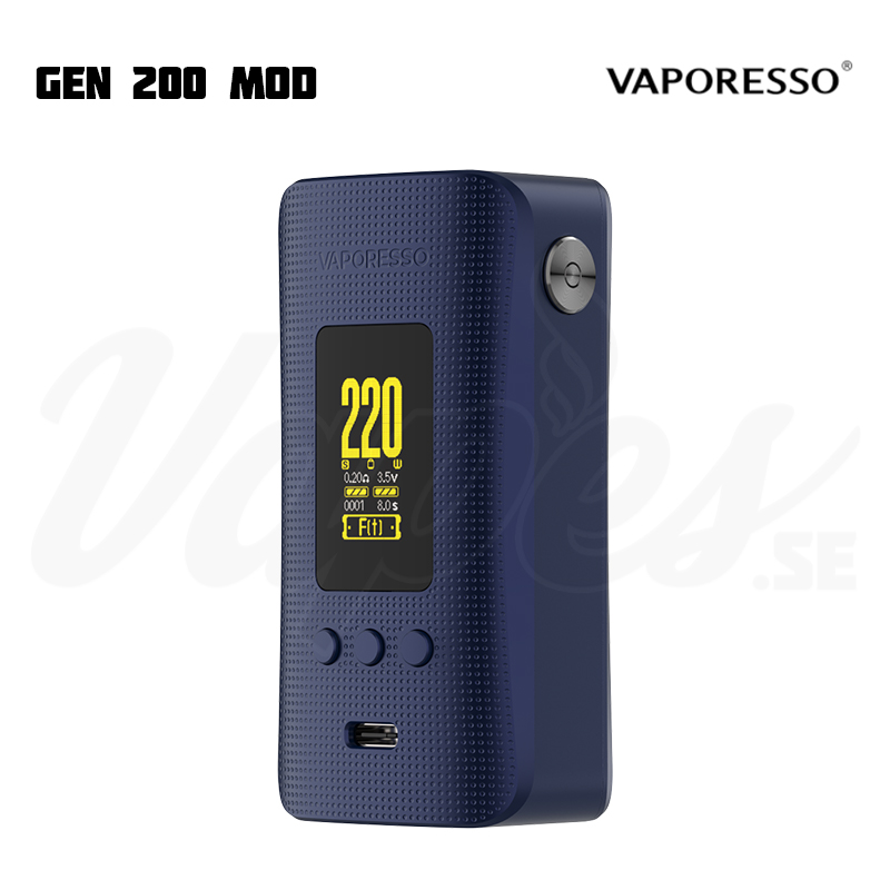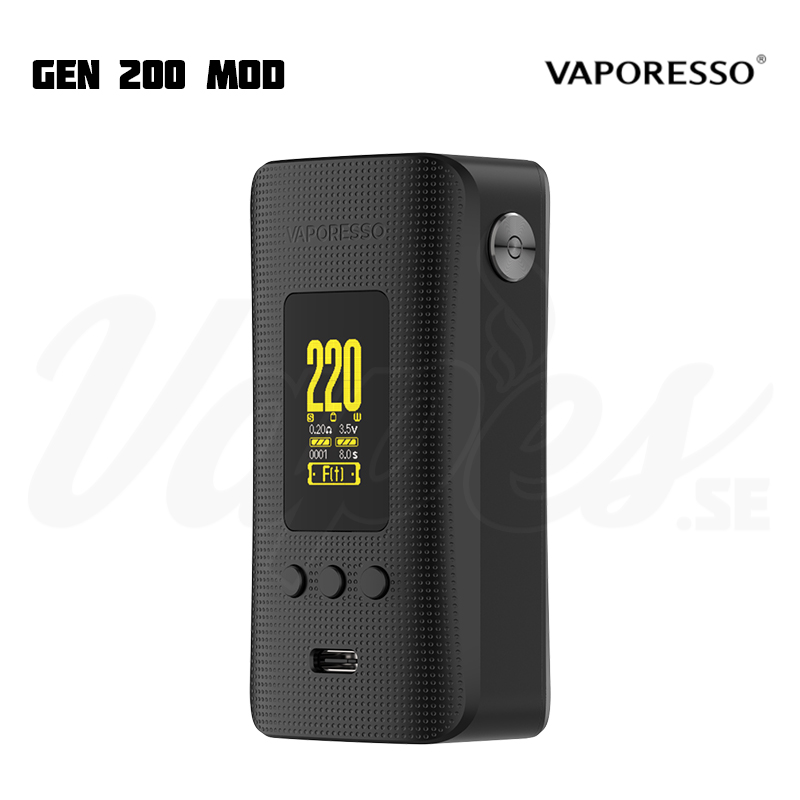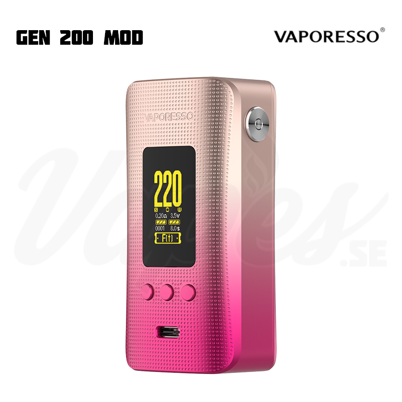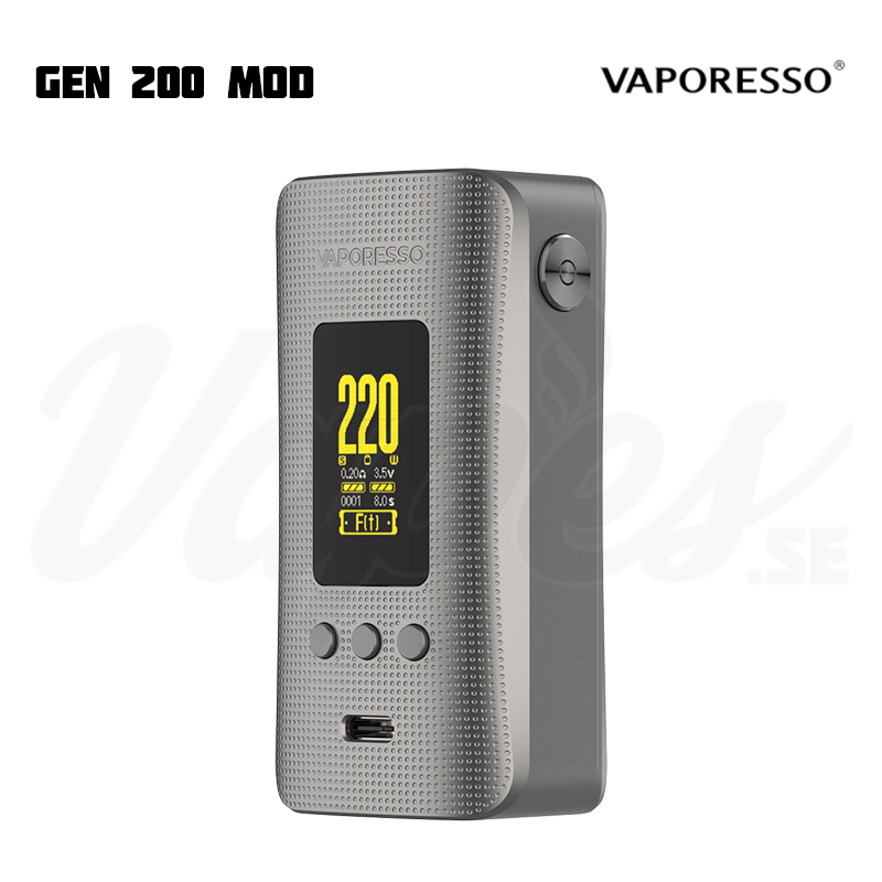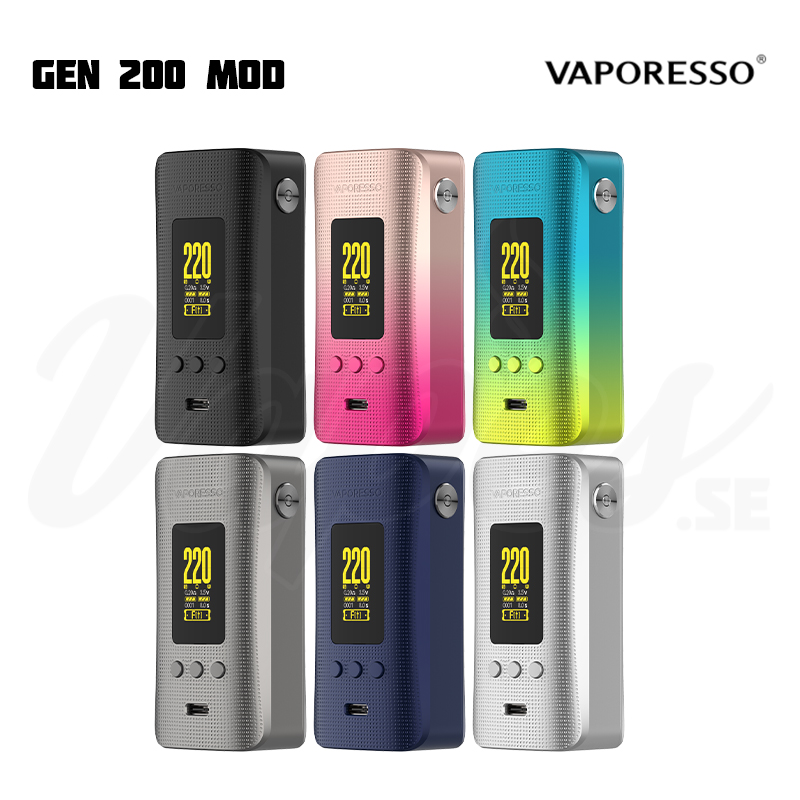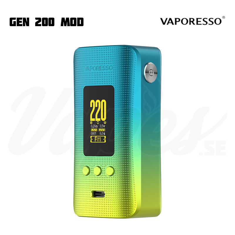 Vaporesso GEN 200 Mod går upp till 200 W och drivs av två stycken 18650 batterier (köpes separat). Laddning sker via USB C och en kabel för laddning medföljer. GEN 200 Mod har många inbyggda säkerhetsskydd för en säker vejpupplevelse och har lägesinställningar anpassade för både nybörjare och avancerade användare. Vaporesso GEN 200 Mod kommer i flera olika färger och är designad för att vara kompakt och lättviktig men samtidigt slittålig.