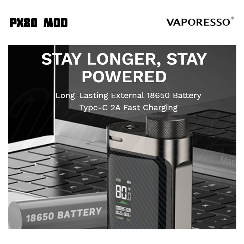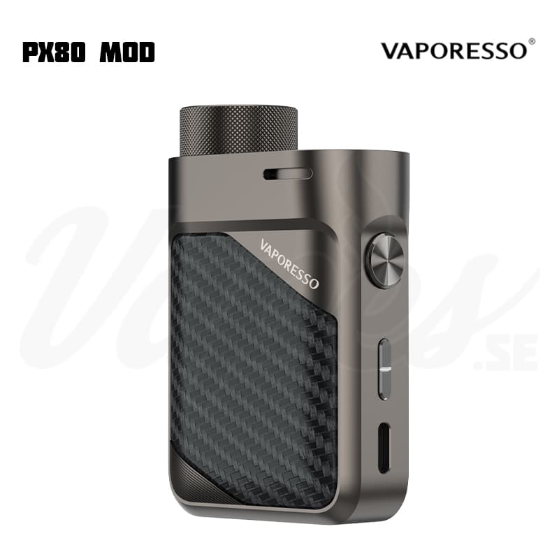 Vaporesso SWAG PX80 Mod är en kompakt mod med utbytbart 18650 batteri (säljes separat). Den är kompatibel både med vanliga 510-gängade tanks (via medföljande adapter) samt SWAG PX80 Pods (utan adaptern). Snabbladdas på 2 A via USB C.
