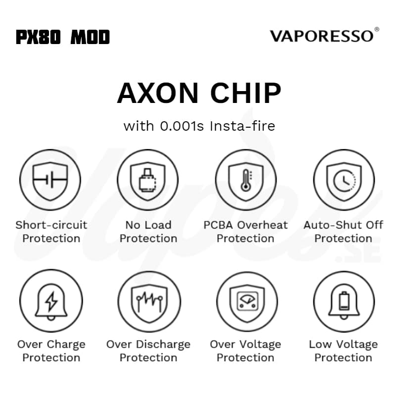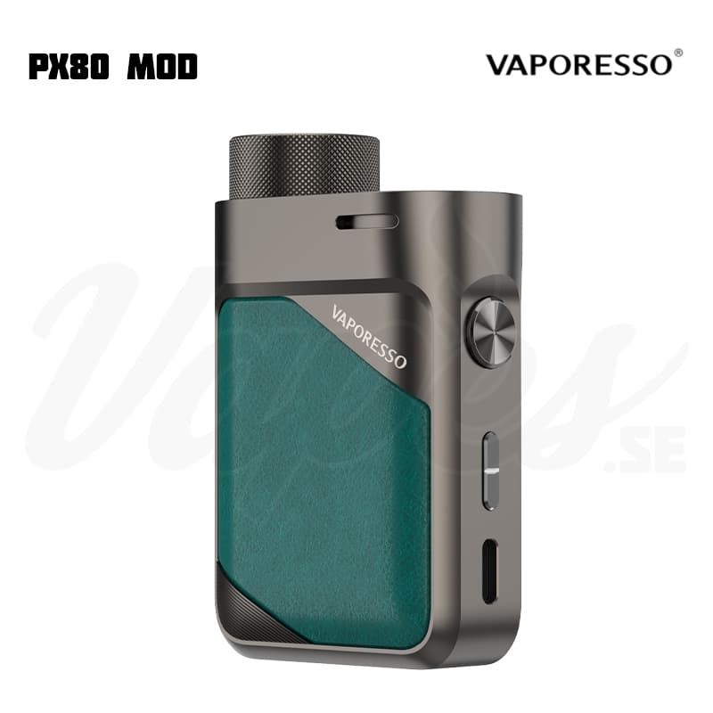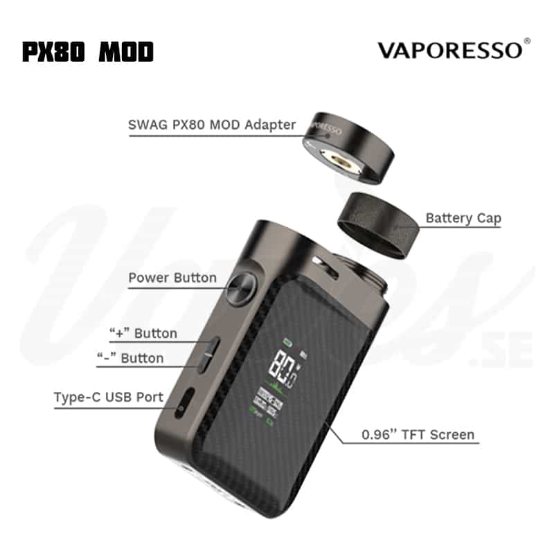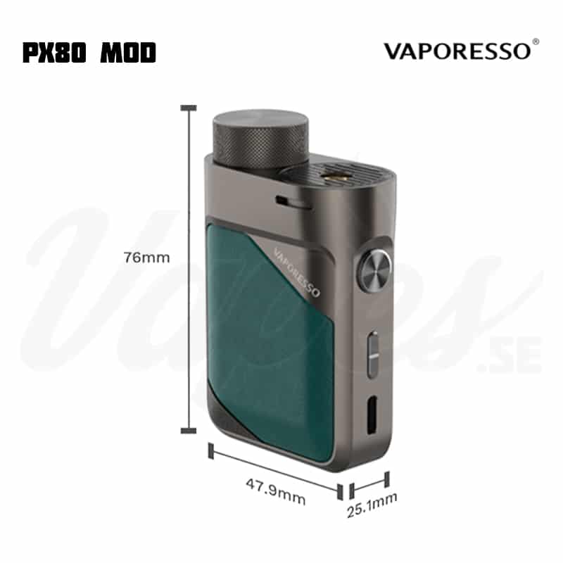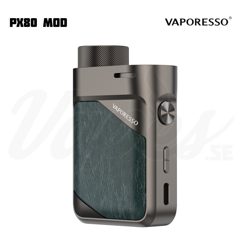 Vaporesso SWAG PX80 Mod är den senast generationens SWAG med utbytbart batteri (köpes separat) och stöd för både vanliga 510-gängade tanks, samt SWAG Pods. Designmässigt följer SWAG PX80 samma form/stil som tidigare SWAG-modeller, med ett batterilock på toppen för en kompakt vape. Batteriet kan laddas snabbt med USB C på 2 A. AXON kretskortet ger många inbyggda säkerhetsfunktioner, upp till 80 W uteffekt, 0,001 sekunders avfyrninghastighet och flera olika lägen att välja mellan (se nedanför) – exempelvis power mode, pulse mode, power-saving mode och power eco mode.