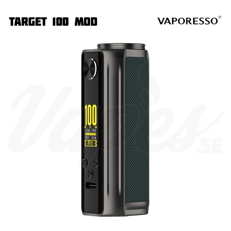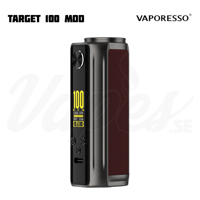 Vaporesso TARGET 100 Mod går upp till 100 W och drivs av ett 18650 batteri (köpes separat). Laddning sker via USB C och en kabel för laddning medföljer. TARGET 100 Mod har många inbyggda säkerhetsskydd för en säker vejpupplevelse och har lägesinställningar anpassade för både nybörjare och avancerade användare. 0,96" skärmen visar allt du behöver veta och tillsammans med knapparna kan du justera inställningar efter personligt behov.