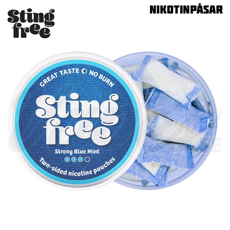 Stingfree Strong Blue Mint All White Snus erbjuder en förbättrad snusupplevelse tack vare sitt patenterade blåa skydd för tandköttet. Denna all white portion har en diskret söt mintsmak med tydlig kylande effekt och är designad för att minimera sveda och irritation som ofta uppstår med andra nikotinportioner. Med sitt slim-format är prillorna diskreta och bekväma att använda, och skyddet ger en långvarig smak- och nikotinupplevelse. Varje dosa innehåller 12 mg/g nikotin, medan en enskild prilla ger 6 mg nikotin.